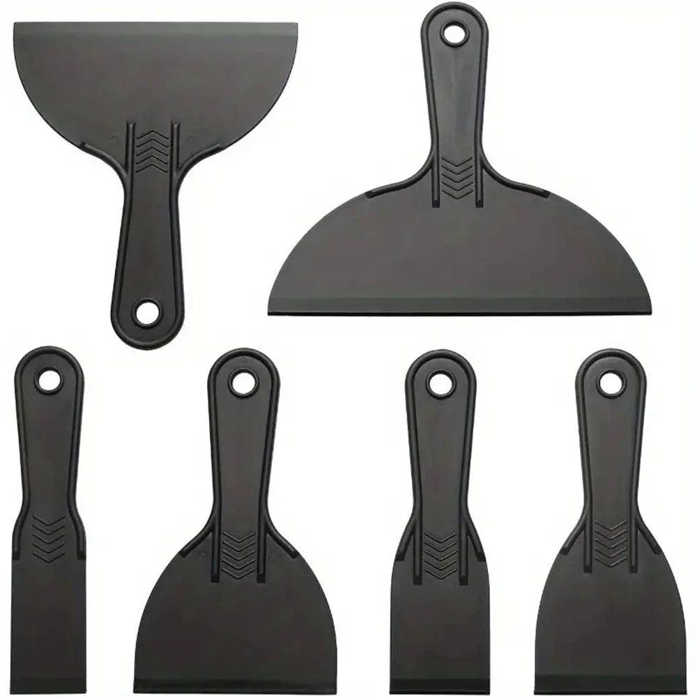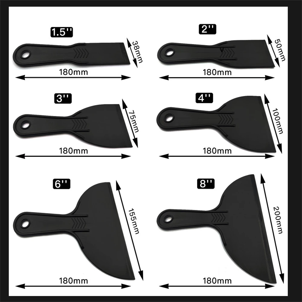 With a variety of sizes (1.5 inch, 2 inch, 3 inch, 4 inch, 6 inch, and 8 inch), this set of black plastic putty knives offers versatility and convenience for all your scraping and filling needs.