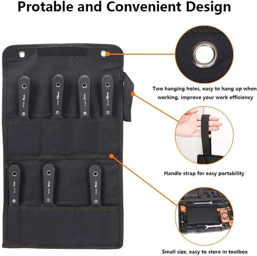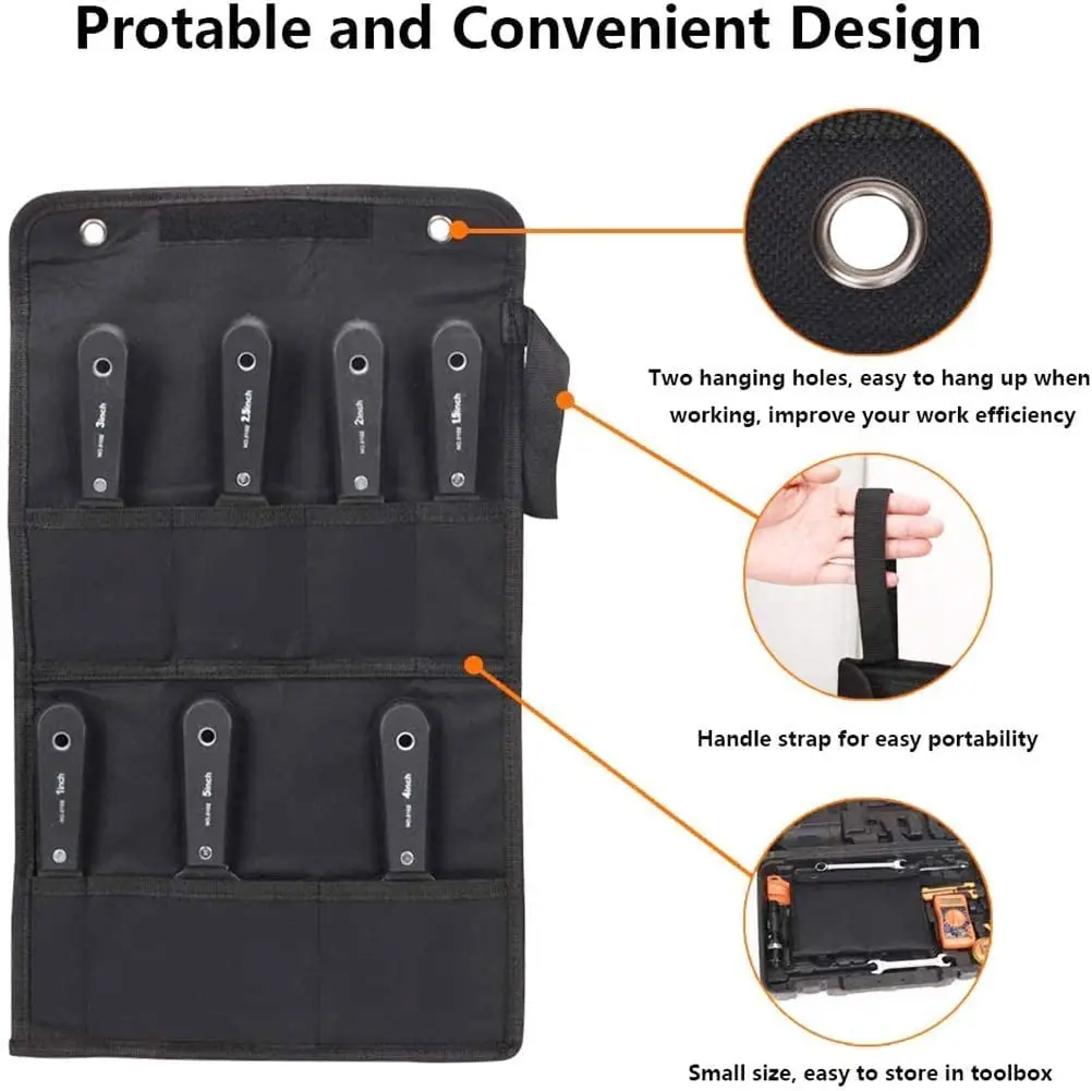 Compact & Portable Wall Filler Tool Set : Our wallpaper scraper hand DIY tools is designed with a conveniently foldable storage bag, which is organized the putty knives securely & tidy them up, making it easier for you to carry your tools.