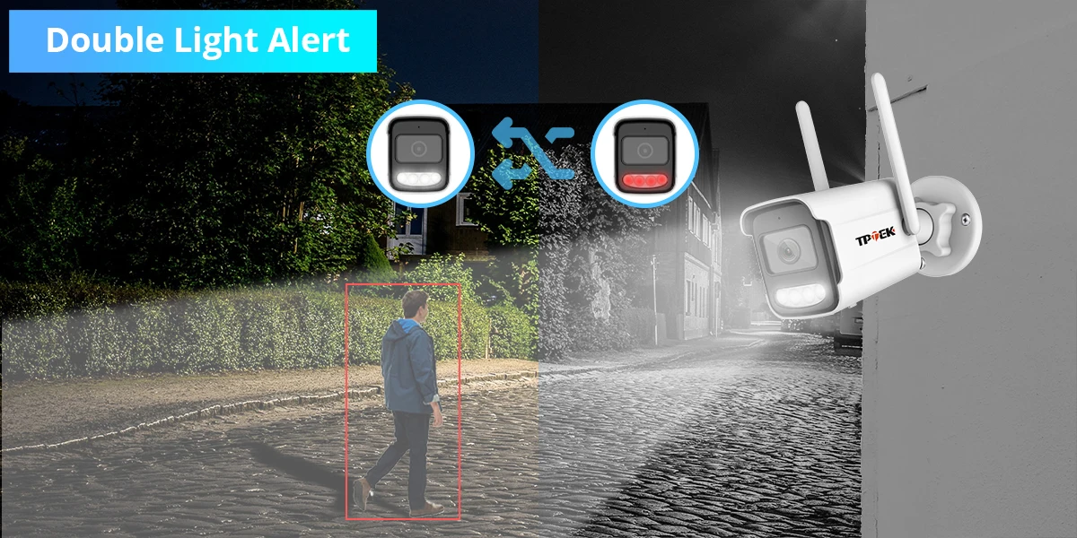 3) You can use "Double Light Alert" mode: when the light is insufficient, the infrared light activates and the camera image is black and white. When the camera detects someone at night, the camera will turn off the infrared light and turn on the white light, meaning the night vision will switch to a color picture. At the same time, the camera will send an alarm message to the mobile app.