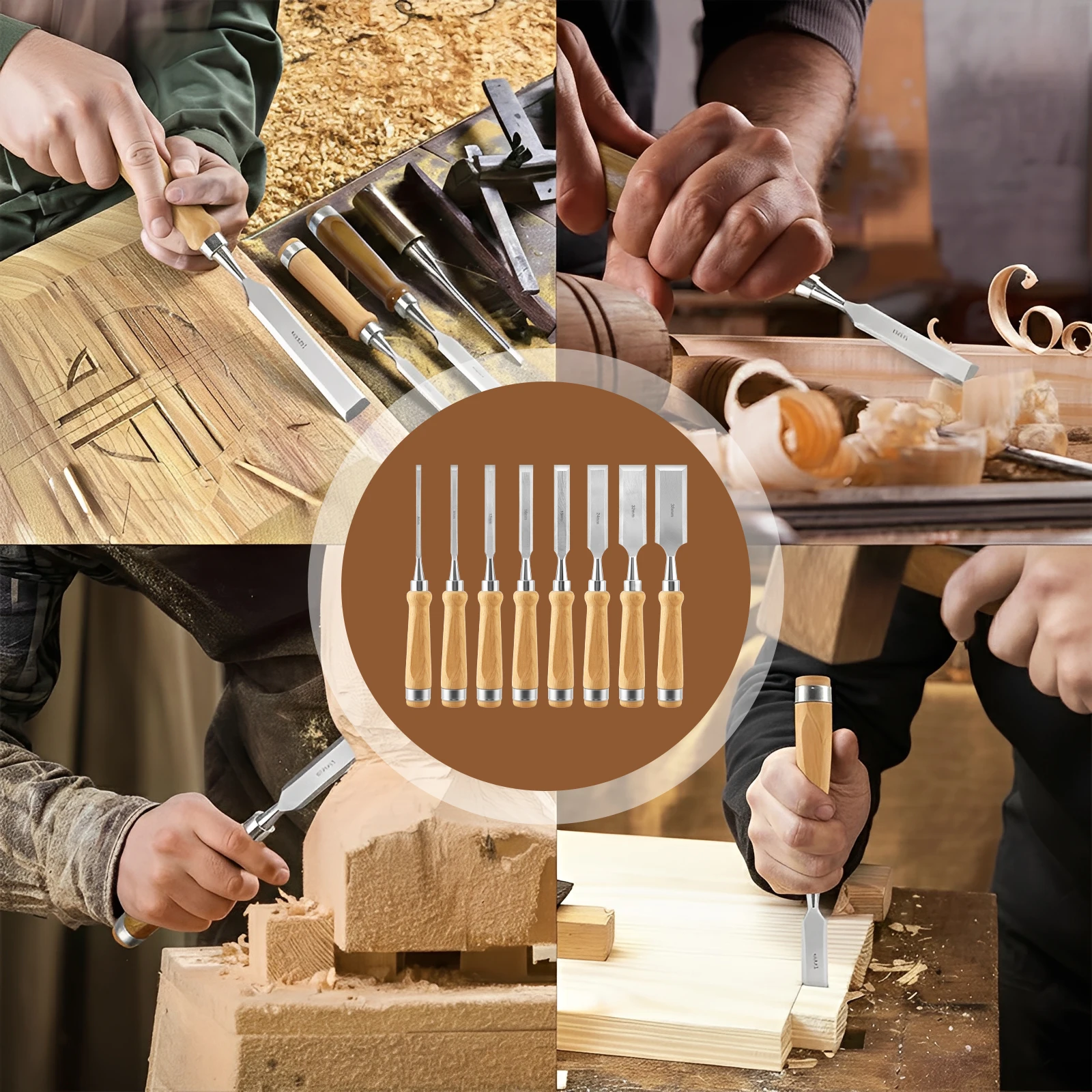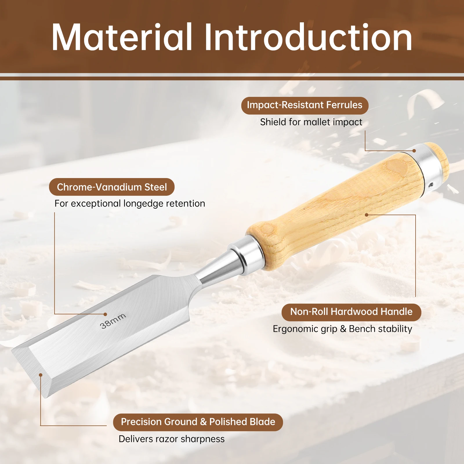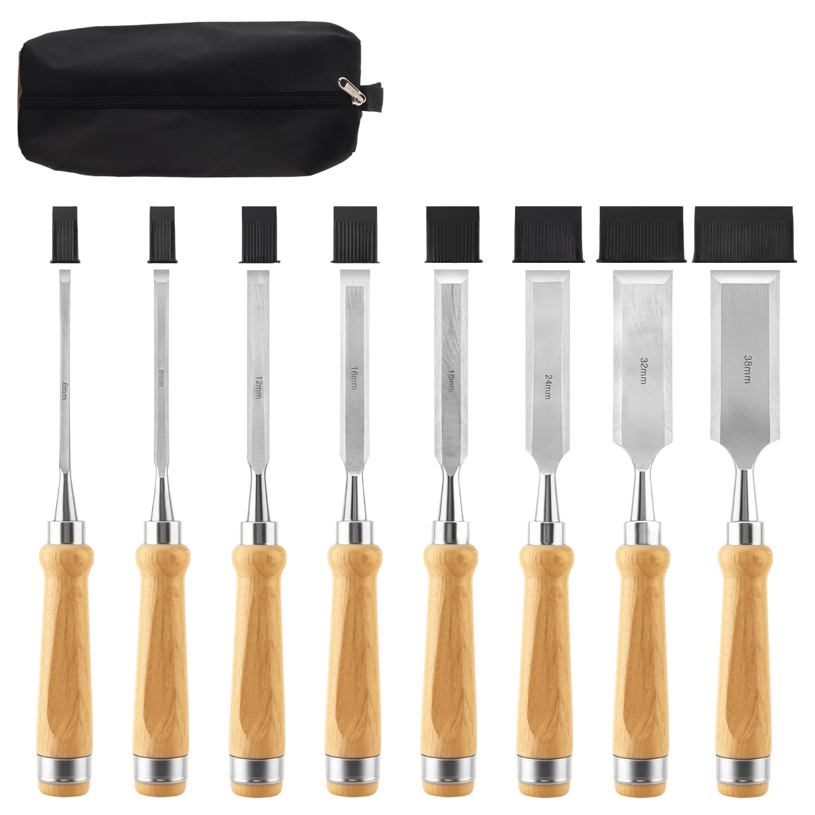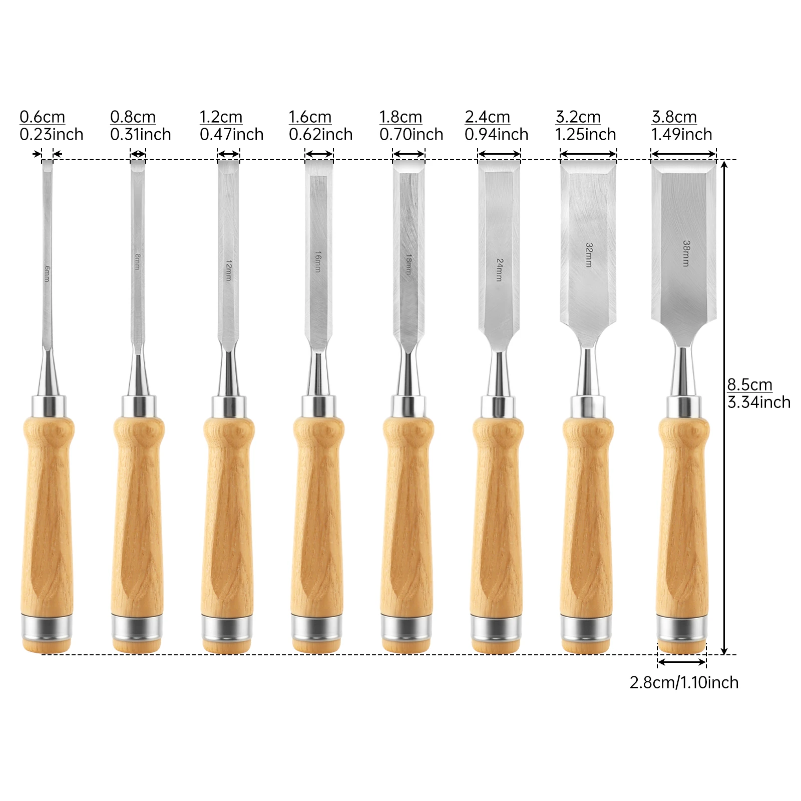 -Full Range of Size: Complete size selection includes 1/4 inch(6mm), 5/16 inch(8mm), 1/2 inch(12mm), 3/4 inch(18mm), 13/16 inch(20mm), 1 inch(24mm), 1 1/4 inch(32mm), 1 1/2 inch(38mm) chisels, covering most woodworking needs for different cutting and carving tasks. - Place of Application: Suitable for working with hardwoods and multiple wood types, meeting requirements of both daily DIY projects and professional woodworking tasks.