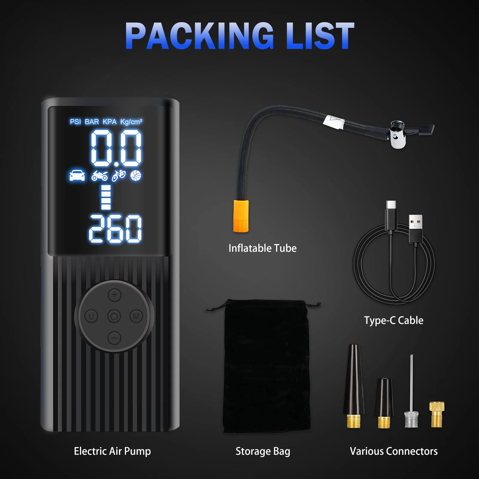 【4+N Modes for Precision in Every Scenario】Supports PSI, KPA, BAR, and KG/CM² pressure units, with four preset inflation modes for bicycles, motorcycles, cars, and balls. It also includes a custom mode for flexible adjustments to suit specific needs, ensuring accurate inflation every time.