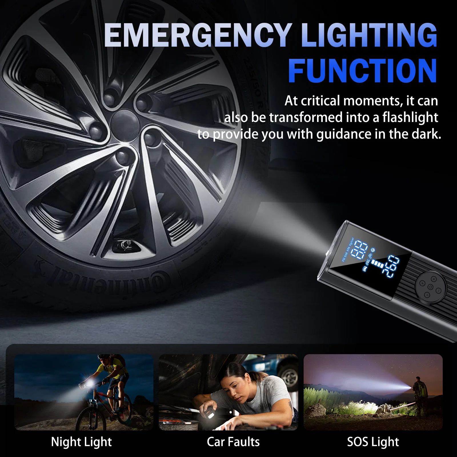 【LED Lighting for Nighttime Visibility】The integrated LED light on the top provides illumination for nighttime inflation or tire changes, offering clear visibility in emergency situations and keeping safety in check.