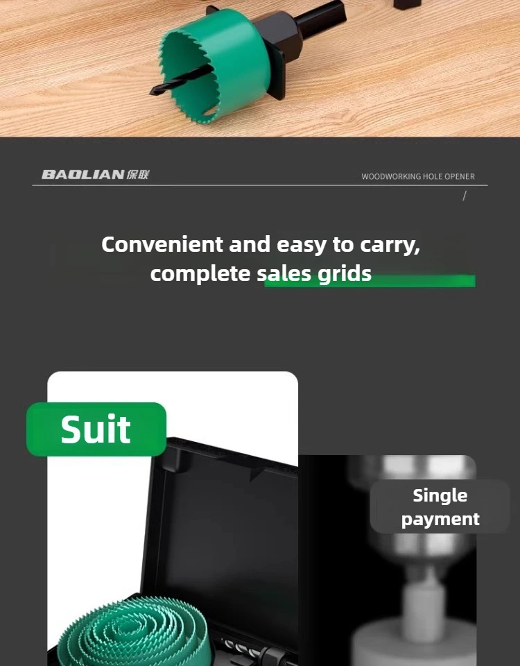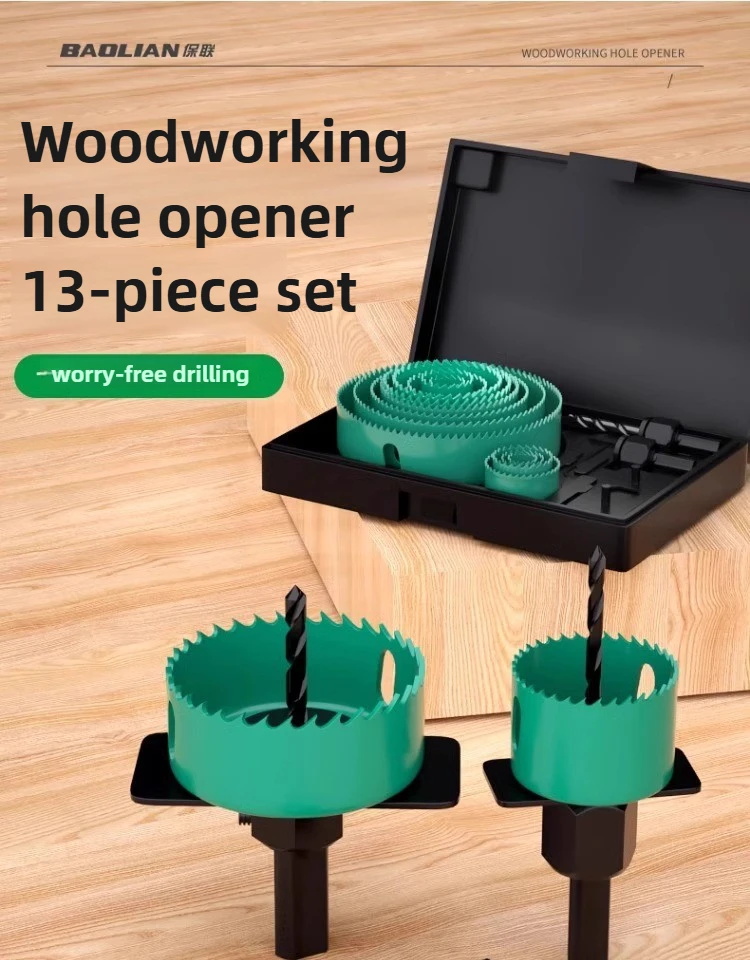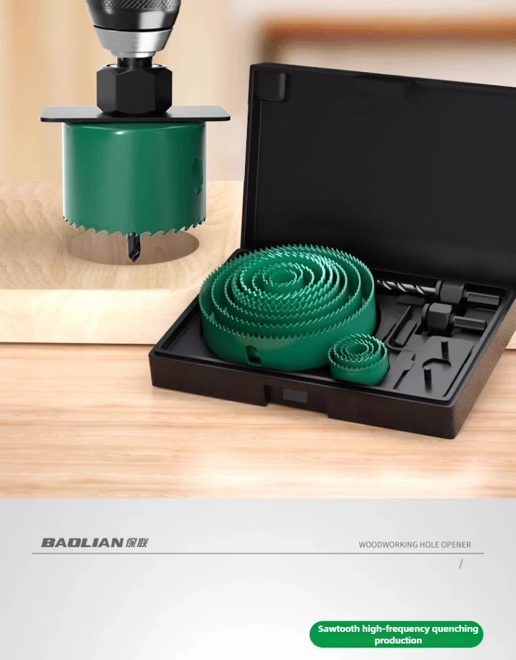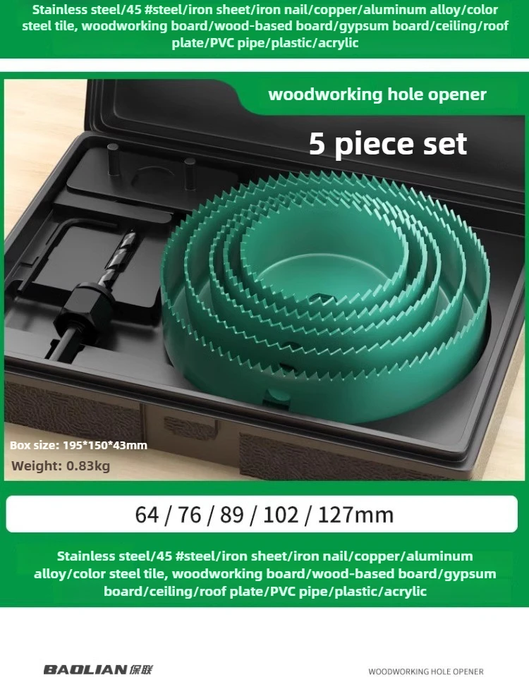 The BAOLIAN Hole Saw Set offers a versatile size range from 19-64mm to 19-127mm, catering to various woodworking needs.