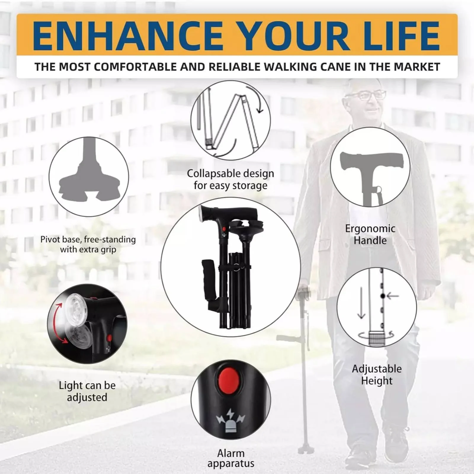 2. Comfortable And Sturdy: The Cane Is Made Of Aluminum And Can Stand On Its Own, Providing Maximum Safety And Durability While Remaining Light. The Soft Handle Is Combined With A Convenient Wristband To Provide Optimal Comfort And Support, Non-Slip, Relieve Pressure On The Wrist And Prevent Muscle Spasms. The Cane Also Has An Alarm, And When The Elderly Are In Danger, You Can Press A Button To Make A Sound To Keep You Safe