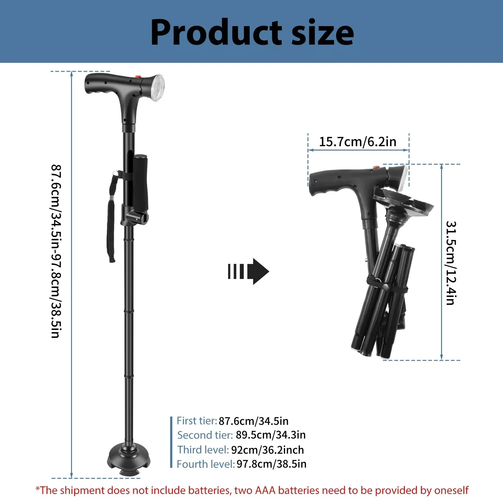 4. With LED Lights: Adjustable Built-In LED Lights Illuminate The Road At Night. Bright Lights Will Guide You Safely In The Dark. The Direction Of Light Can Be Adjusted, And Different Lighting Angles Can Be Adjusted. We Offer You A Lightweight Premium Crutch That You Can Move Around With Confidence! Please Note That This Cane Does Not Include Batteries And Must Be Purchased On Your Own