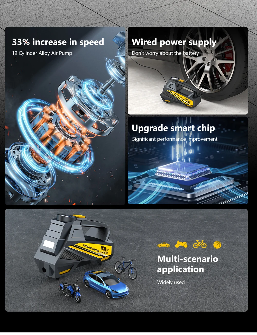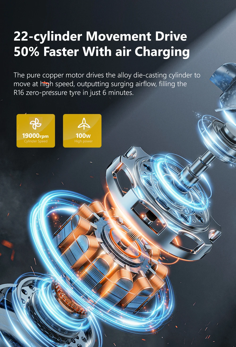The pure copper motor drives the alloy die-casting cylinder tomove at high speed, outputting surging airflow, filling theR16 zero-pressure tyre in just 6 minutes.