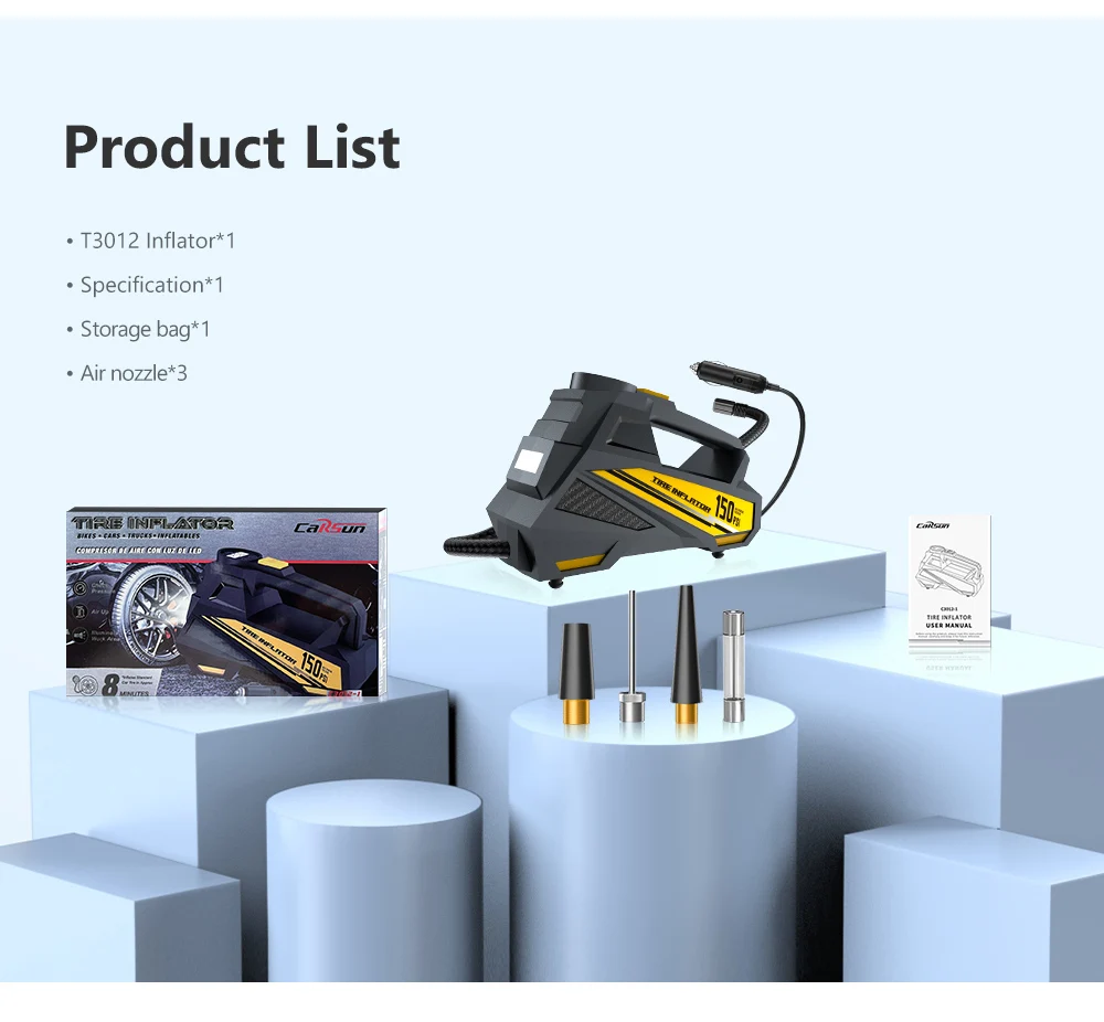 Plug in the cigarette lighter to use, the cable length is 3M to meet the whole car 4 tires inflatable.