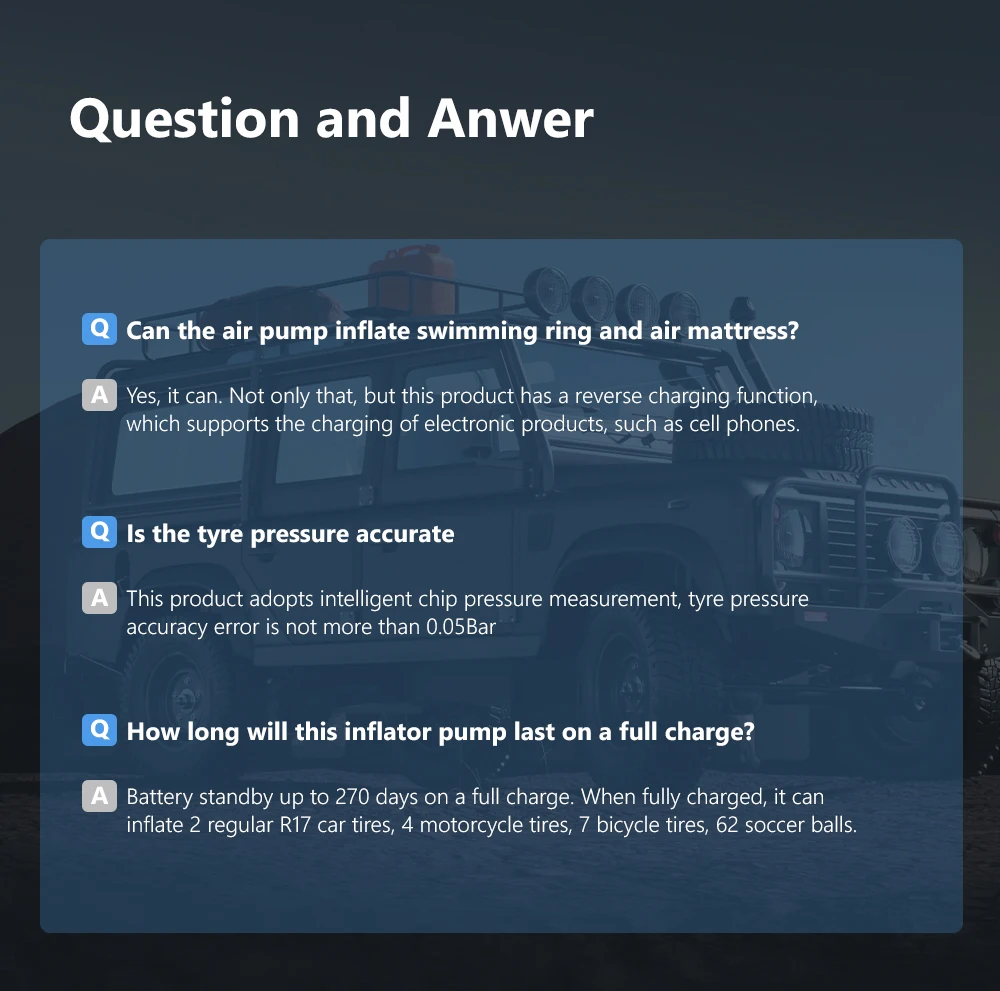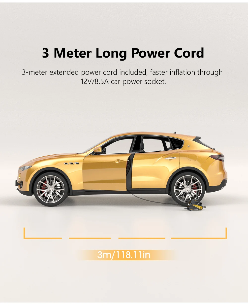 3-meter extended power cord included, faster inflation through 12V/8.5A car power socket.