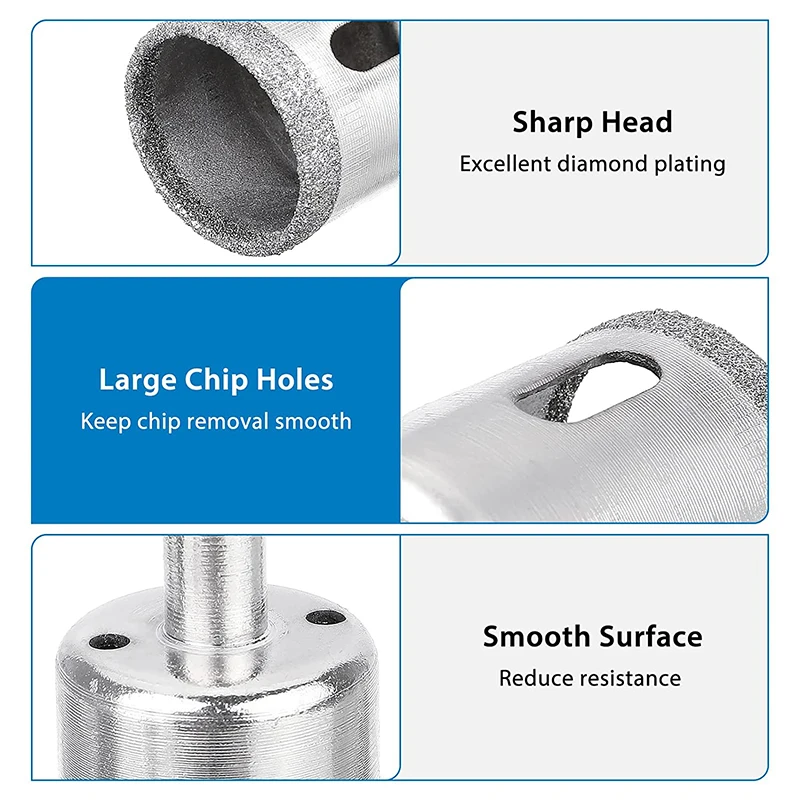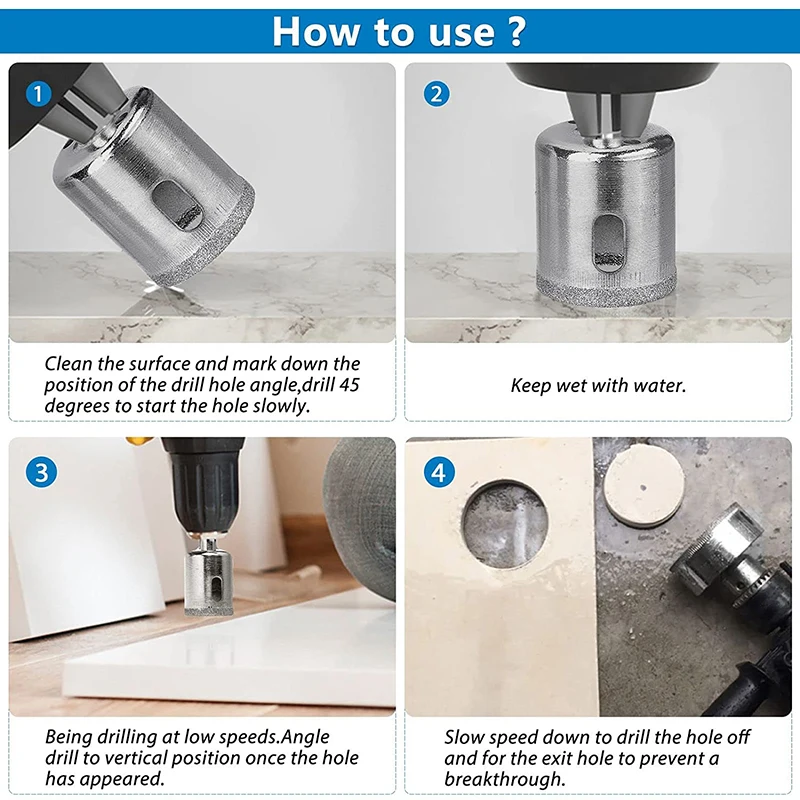 Good Material-Diamond hole saw is made of carbon steel and coated with nickel to resist corrosion. Diamond drill bit creates a high precision, smooth cut with no broken edges. Reduced drill speeds, low drill pressure and increased use of water lubrication will extend drill bit life considerably.