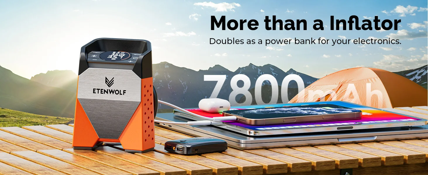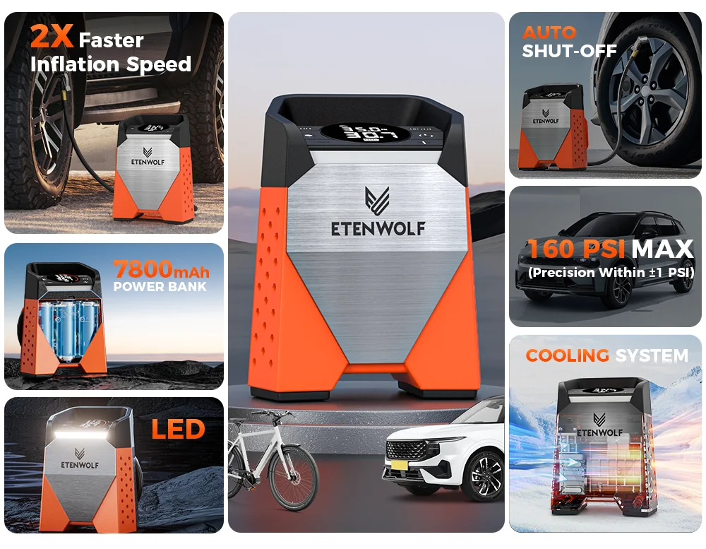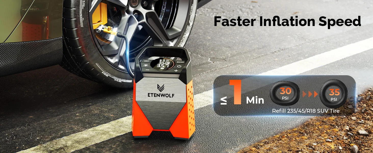 2.7800mAh Battery, 35L/M @ 0PSI (0.75CFM @ 0PSI) high-speed inflation, 160PSI (11bar).