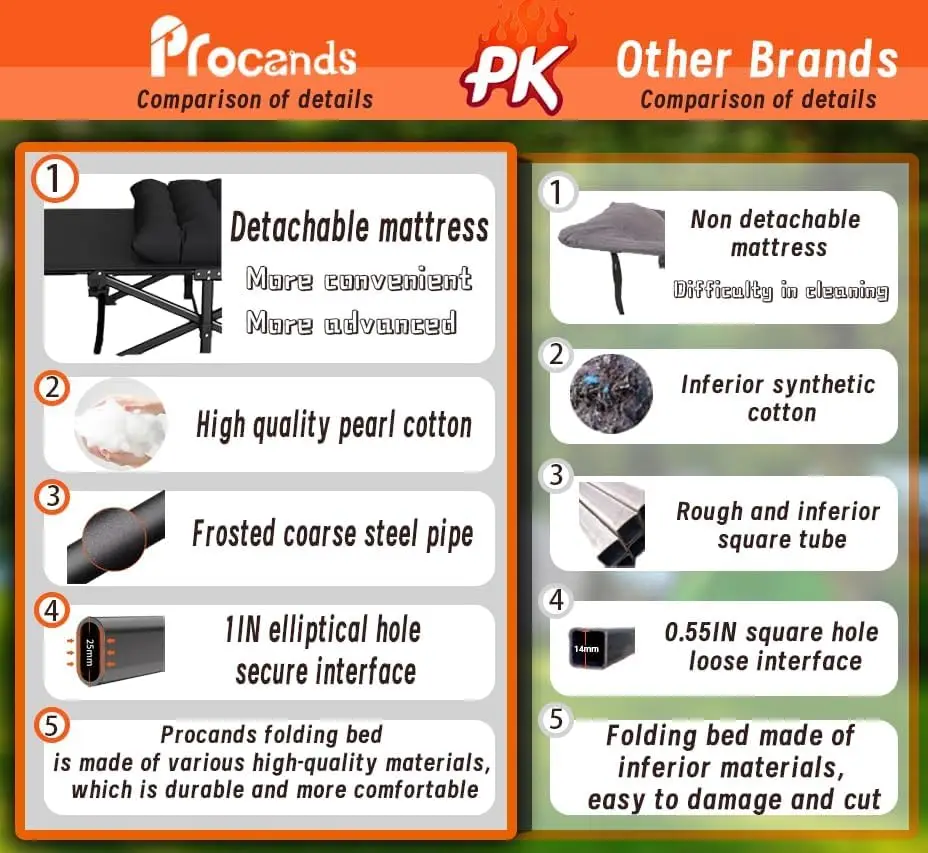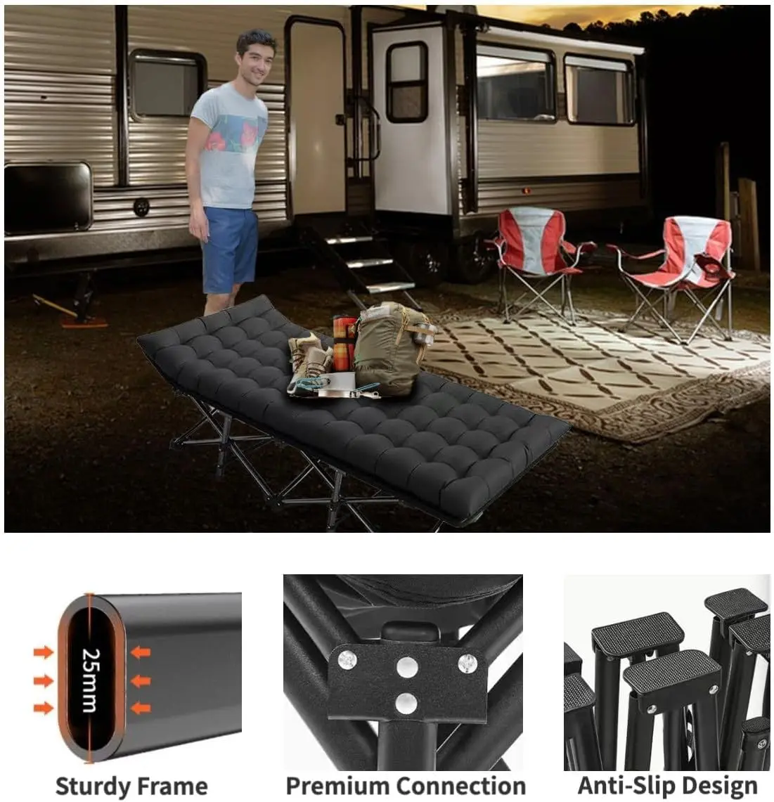 Experience ultimate outdoor comfort with our premium folding camp cot designed for superior relaxation and durability. This extra-wide 32-inch sleeping surface accommodates all body types comfortably, providing ample space for restful sleep during your adventures. **UNMATCHED COMFORT & SUPPORT** Featuring a detachable premium mattress crafted from soft pearl cotton with elastic corner bands for secure fitting. The ergonomic tilted head design effectively prevents back, neck, and shoulder pain while the crossbar-free construction ensures you never feel the frame beneath you. In warmer months, the mattress can be removed to enhance breathability and cooling comfort. **HEAVY-DUTY CONSTRUCTION** Built to withstand rigorous outdoor use with an anti-rust square steel frame and double-layer 1200D Oxford fabric that provides exceptional strength and water resistance. Supporting up to 900 pounds, this robust camping bed easily accommodates one adult or two children simultaneously. The reinforced joints and thicker steel tubing ensure long-lasting performance in various conditions. **EFFORTLESS PORTABILITY** Designed for convenience with quick-fold technology that sets up in seconds without any assembly required. The lightweight yet sturdy frame folds compactly into the included high-quality nylon carry bag with handle, making transportation and storage incredibly simple. Perfect for spontaneous trips or organized excursions where space optimization matters. **VERSATILE OUTDOOR COMPANION** Ideal for camping, hiking, road trips, hunting expeditions, beach outings, poolside relaxation, RV adventures, backyard lounging, guest accommodations, and emergency situations. Whether you’re in a tent, cabin, patio, or office break room, this versatile cot provides reliable comfort wherever your journey takes you. **PEACE OF MIND GUARANTEE** Backed by comprehensive 2-year coverage with 24/7 technical support and a 30-day exchange policy for complete customer satisfaction. Our dedicated support team is always available to assist with any questions or concerns about your outdoor sleeping solution.