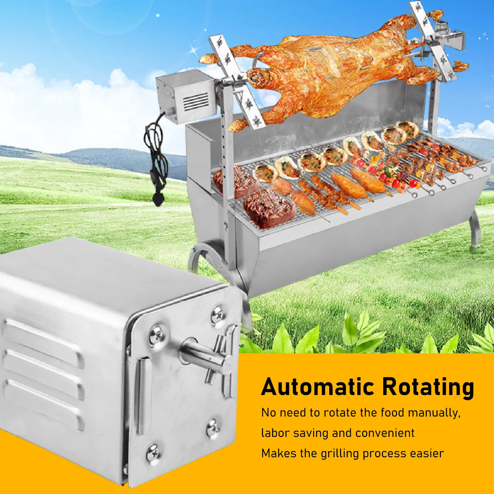 2、AUTOMATIC ROTATION: The electric rotisserie motor can rotate automatically, no need to rotate the food manually, labor saving and convenient, making the grilling process easier.