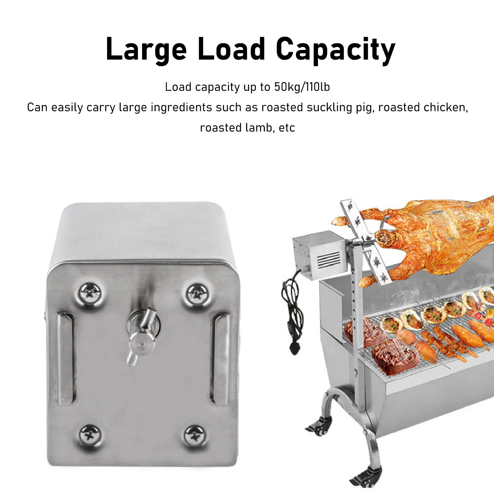 3、LARGE LOAD BEARING CAPACITY: This electric barbecue motor has a weight capacity of 50kg/110lb, which can easily carry large ingredients such as roasted suckling pig, roasted chicken, roasted goat and so on.