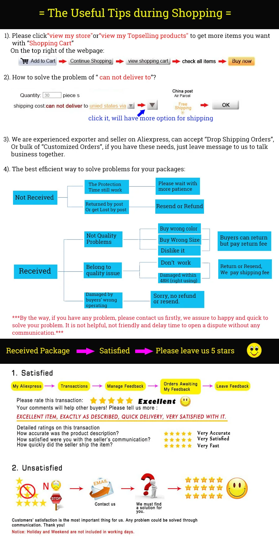 We always maintain high standards and excellence customer service, and strive for 100% customer satisfaction! Feedback is very important, we need you to contact us immediately BEFORE you consider to give us neutral or negative feedback, so that we can solve your problems and make you satisfied.