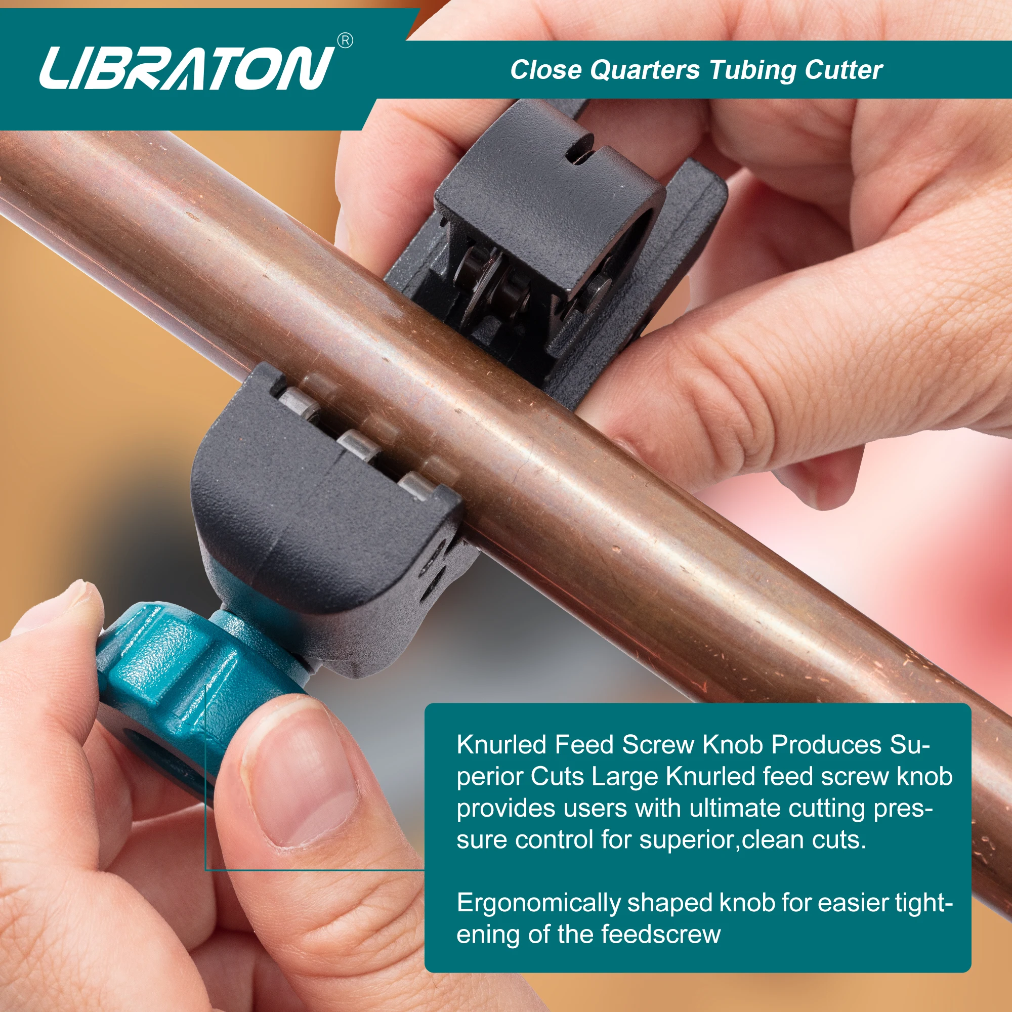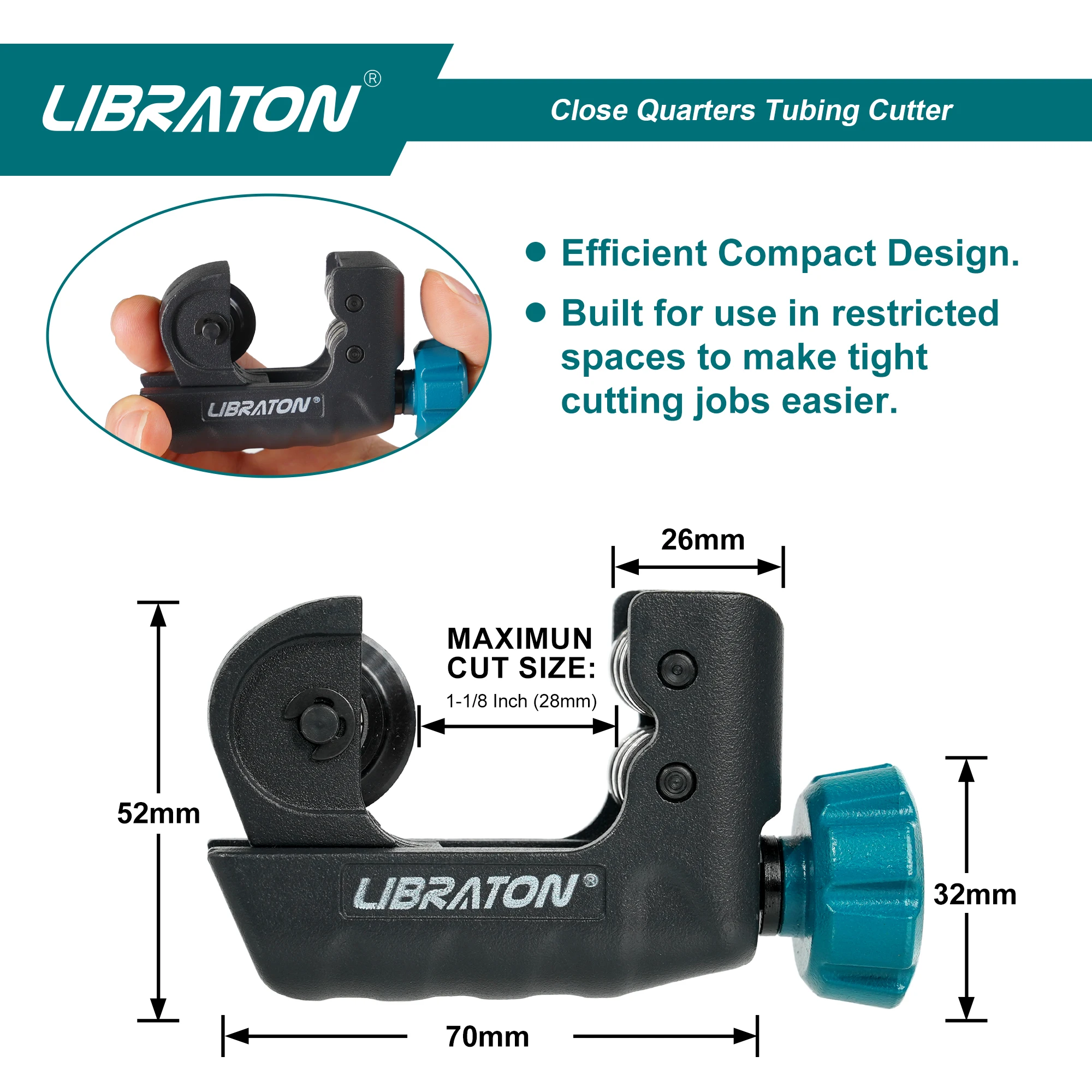 Application in narrow space:The tubing cutter tool is of small size, and it can be held in one hand. The small size design also supports that it can be used in anarrow space, like between pipes or tubes. It is also suitable for cutting tubes or pipes in plumbing jobs.