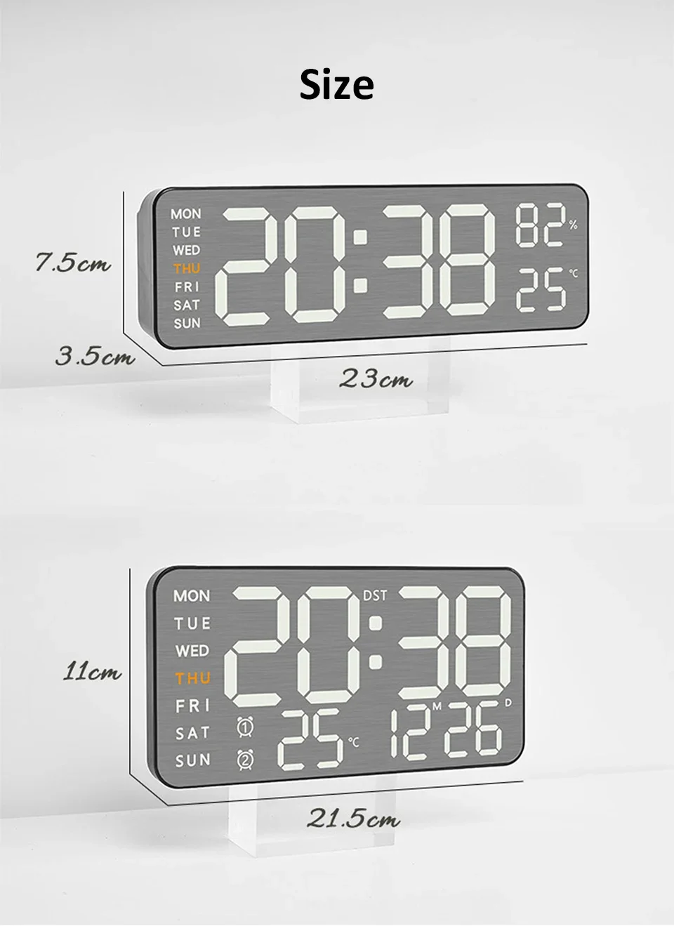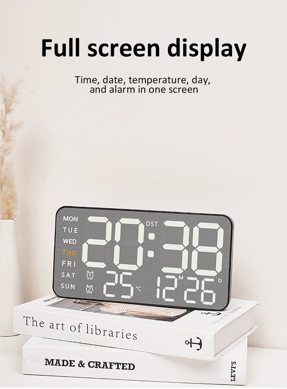●Time, date, temperature, week, alarm all displayed on one screen.