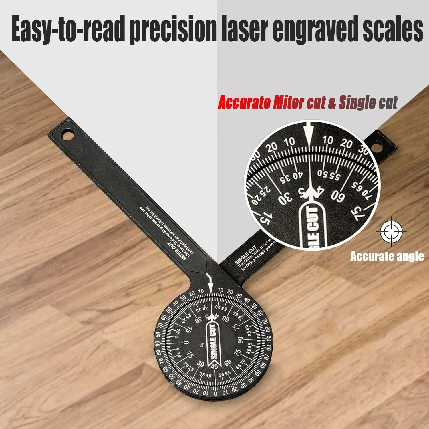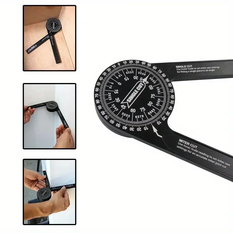 Easy to Use : The protractor angle finder is featured with inside & outside scales to measure angle for single cut and miter cut. For a single cut, please use the inner arrow and outer scale, eg 30° produces 30°angle. And for miter cut, please use the outer arrow and inner scale, eg 35°produces 70°angle