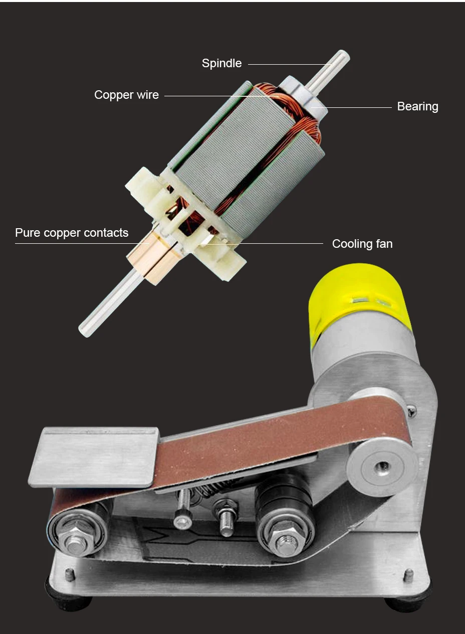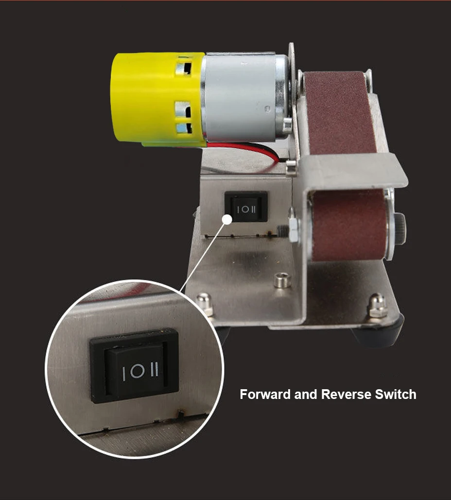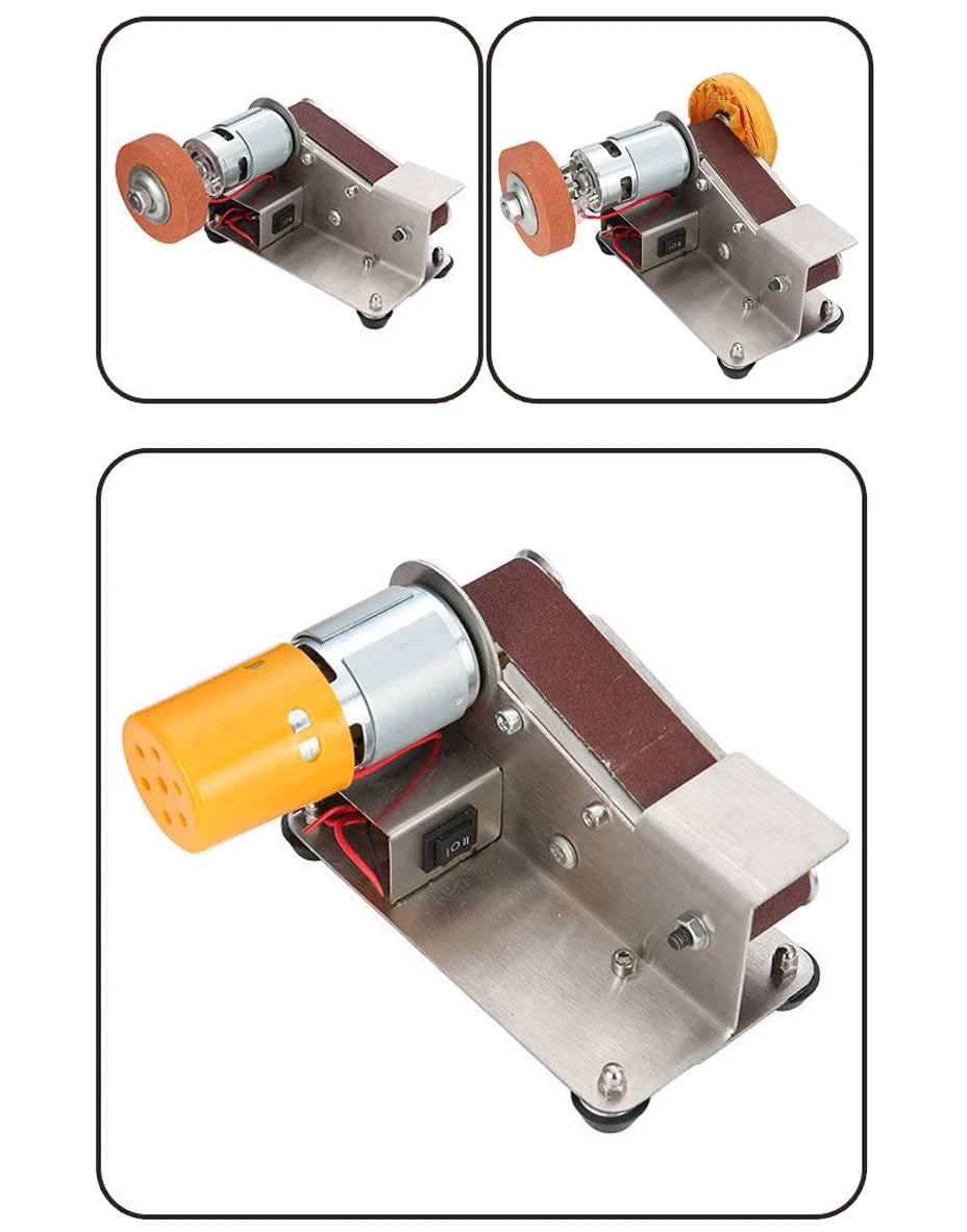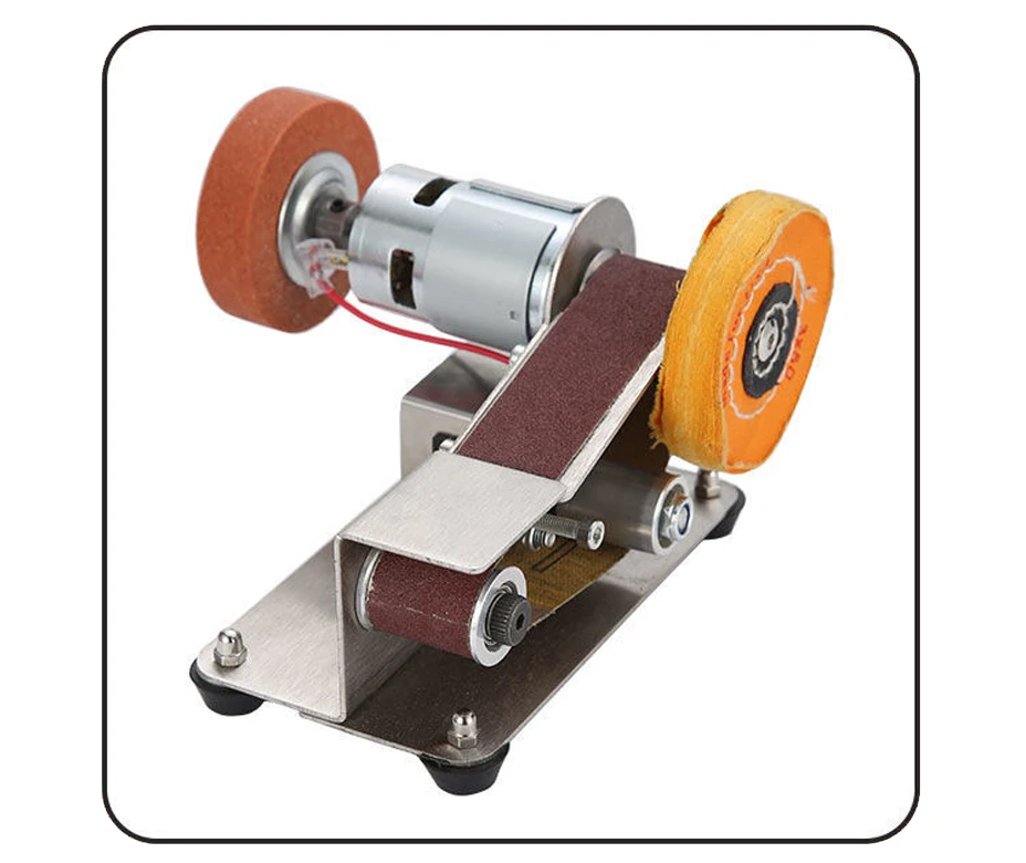 This is a multifunctional belt sander, mini portable, low noise, can be used for high-speed steel drill bit rough grinding, blade edging, fine grinding tungsten steel turning tool, polishing Bodhi root, etc., easy to install and operate, is a home DIY tool.