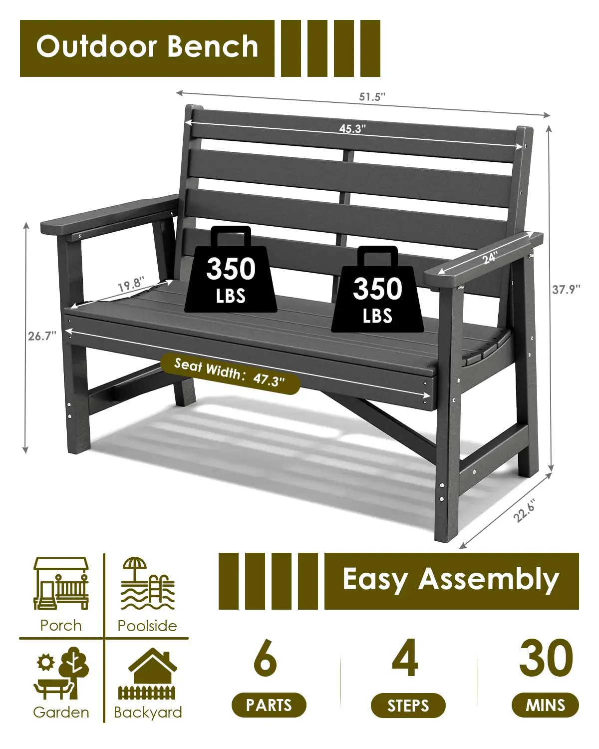 【Optimized Dimensions】Overall bench dimensions: 51.5” W x 22.6” D x 38” H | Product weight: 61 lbs | Maximum weight capacity: 700 lbs. The bench comes with easy-to-follow instructions and requires minimal tools for assembly, so you can enjoy your new outdoor seating in no time