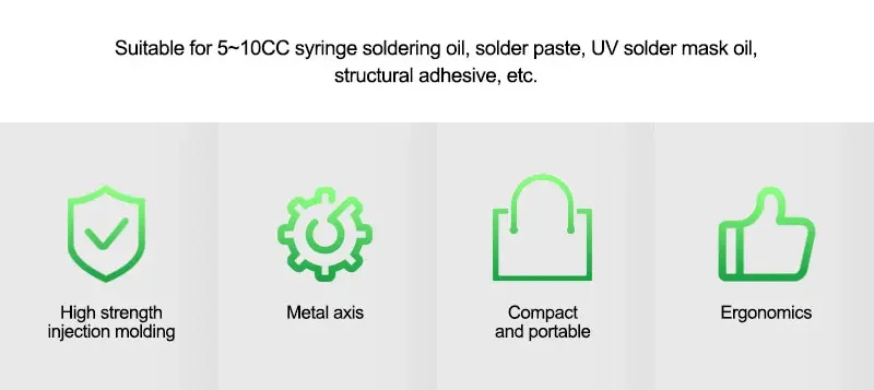 –Suitable for 5~10CC syringe soldering oil, solder paste, UV solder mask oil, structural adhesive, etc.
