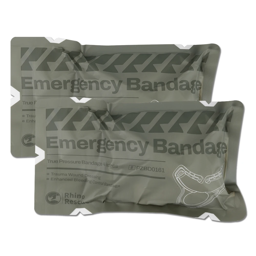 The RHINO RESCUE compression bandage is a tactical first-aid device for the staunching of blood flow from traumatic hemorrhage wounds in pre-hospital emergency situations.