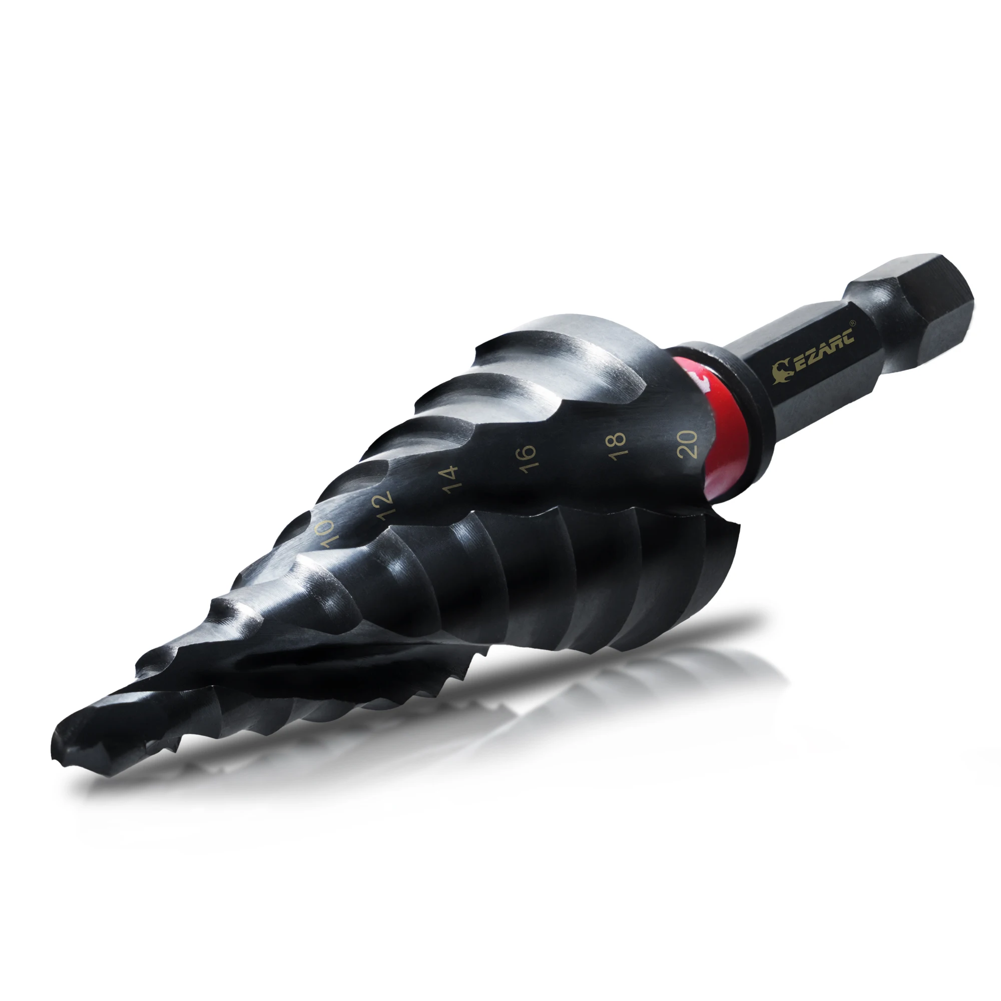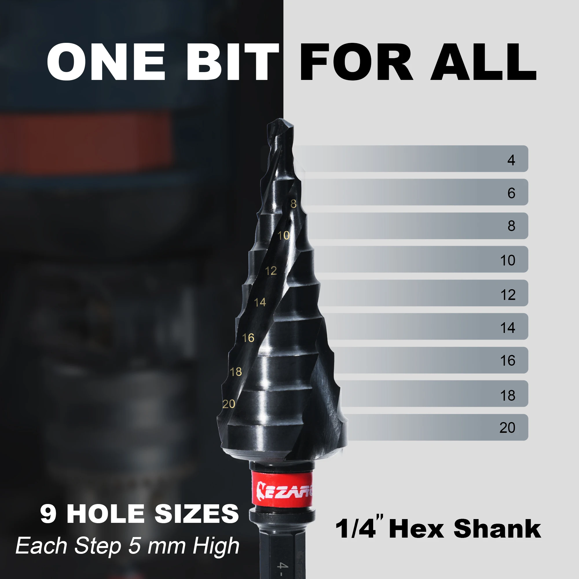 【9 Step Sizes】Spiral flute design, featuring 9 distinct steps from 4 to 20 mm, offers seamless and effective drilling across various thicknesses, eliminating the need for multiple bits. Includes 4 mm, 6 mm, 8 mm, 10 mm, 12 mm, 14 mm, 16 mm, 18 mm, 20 mm.