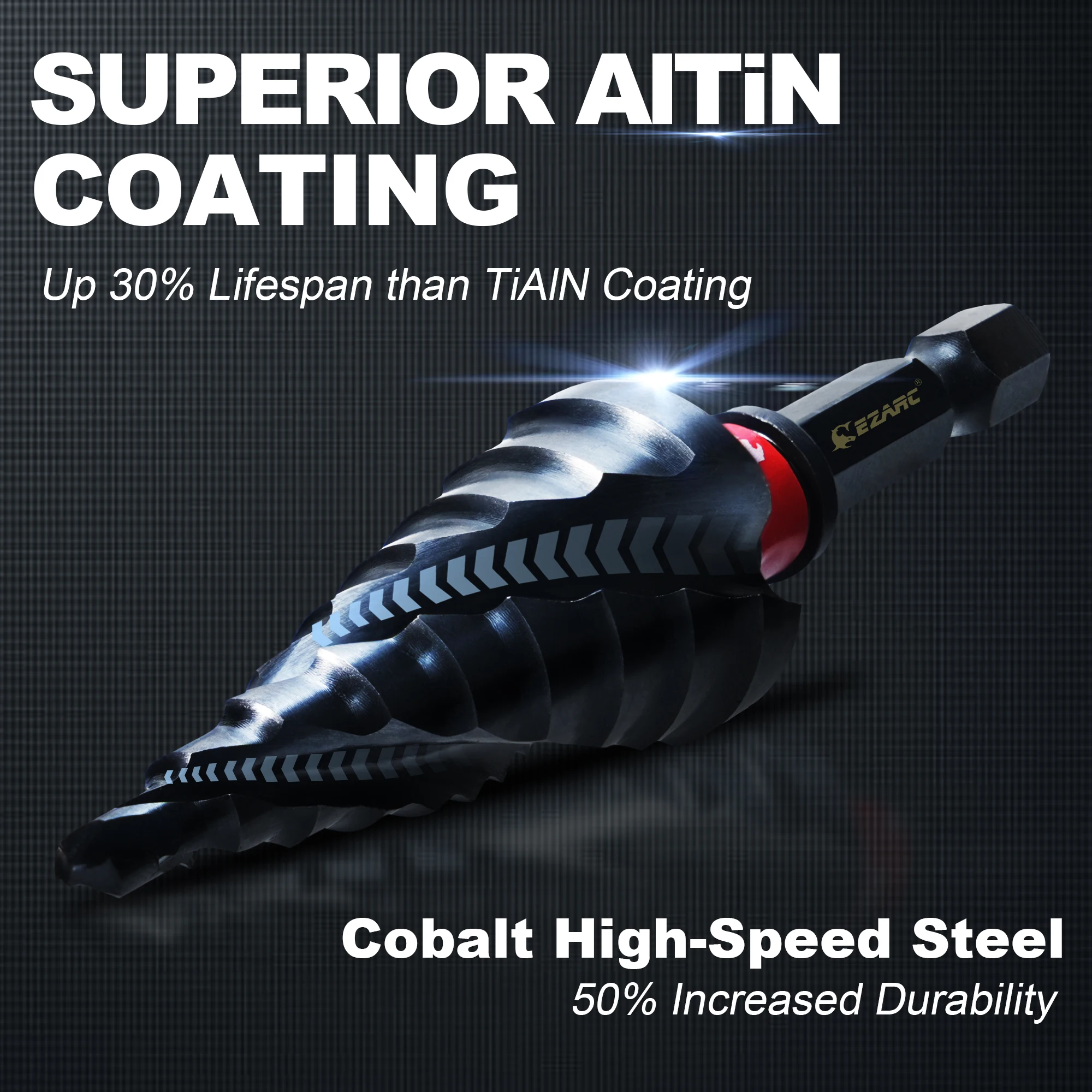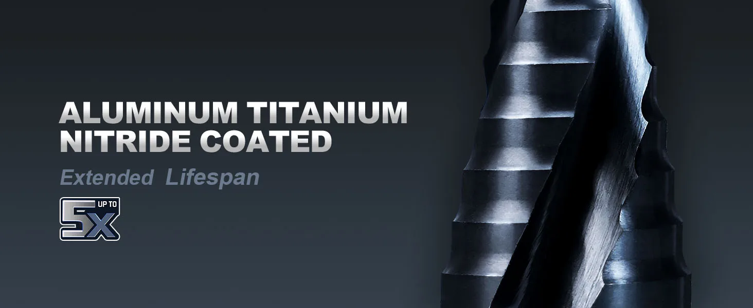 【AlTiN Coating】Step bits coated with aluminum titanium nitride, rated at 89HRC for exceptional hardness and thermal properties. This coating offers superior resistance to heat, wear, and corrosion, with high adhesion and low friction. Laboratory tests show it more durable than steamed black oxide coating for longer bit life.