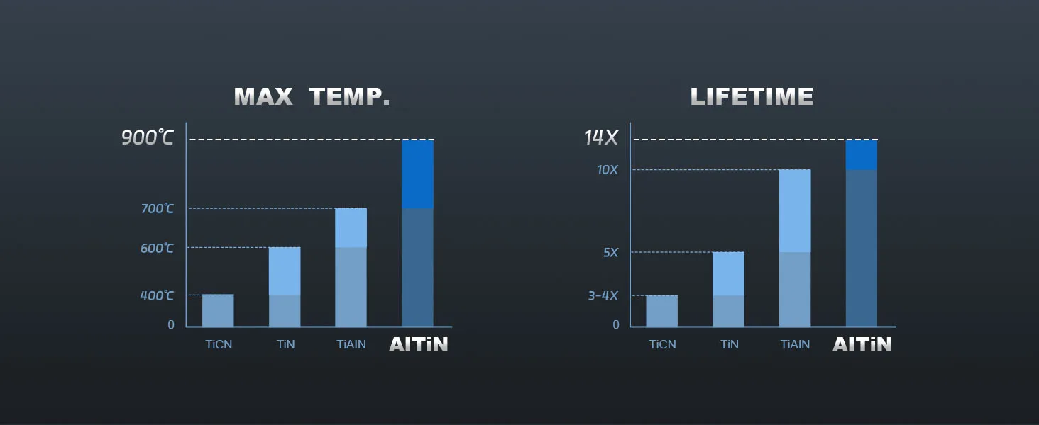 AlTiN Coating, with a hardness of 89 HRC, offers excellent hardness and thermal properties. It provides great resistance to heat, wear, corrosion and can withstand temperatures up to 900°C.