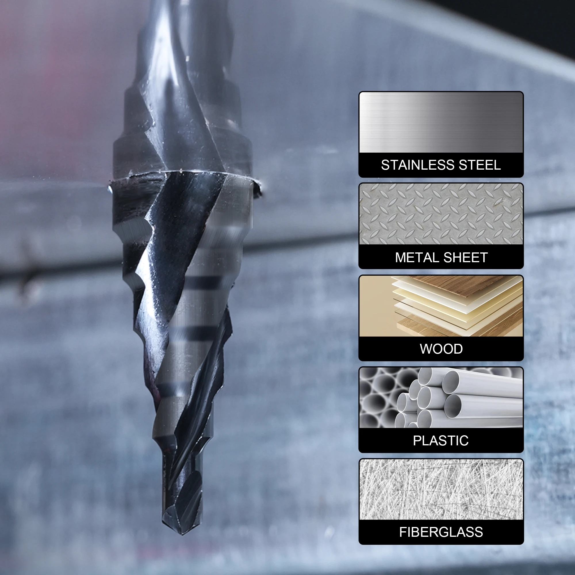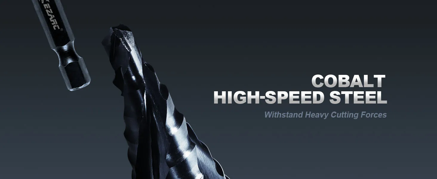 【M35 HSS Step Drill】M35 cobalt high-speed steel achieves high levels of hardness and wear resistance through appropriate heat treatment. Its toughness and bending strength surpass those of standard high-speed steel, making this step drill bit more suitable for cutting harder materials, such as mild steel, medium hardness steel, stainless steel.