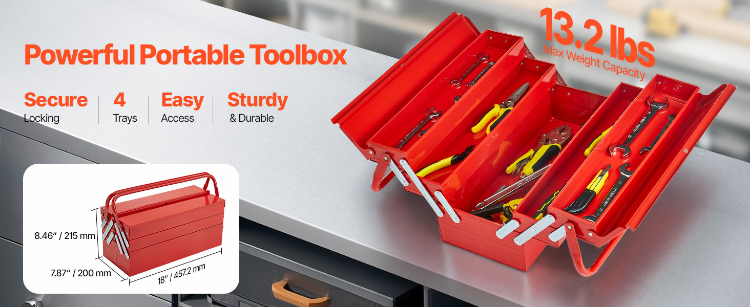 Generous Storage Capacity: Measuring 18 x 7.87 x 8.46 inches, this toolbox offers two layers, including four trays and a bottom compartment, providing a total capacity of 13.2 lbs. Perfect for storing and organizing your tools and accessories on the go.