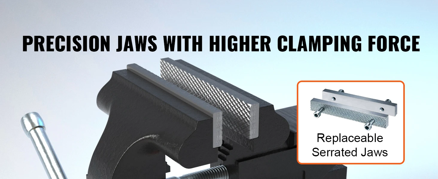 • 【Built to Last】: The swivel vise is forged from sturdy cast iron, with a powder coating on the surface for a rust-proof finish. High-quality nuts and screws increase durability. Replaceable serrated jaw plates are made of premium carbon steel for superior grip. Go above and beyond and knock out all those tough projects!