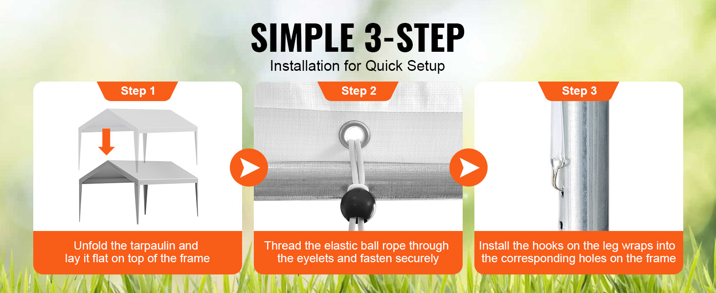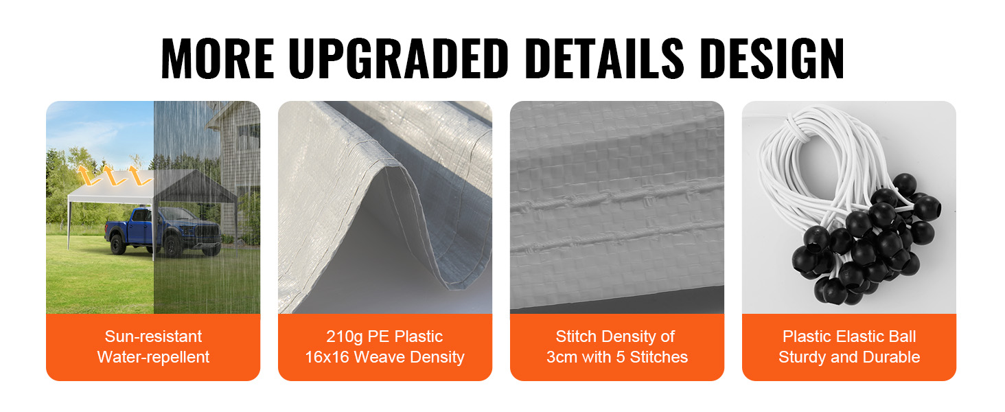 Durable Material: The garage canopy fabric is made of PE plastic woven fabric, crafted with a 16×16 weave pattern, thick material for water pooling-resistant, with double-layer heat-sealed seams at the canopy joints for added durability. The four leg wraps tightly encase the fabric, enhancing the canopy’s stability for long-lasting, deformation-resistant use.
