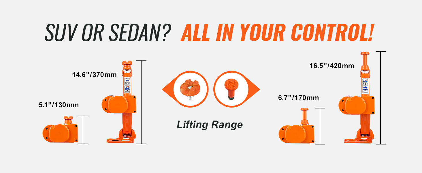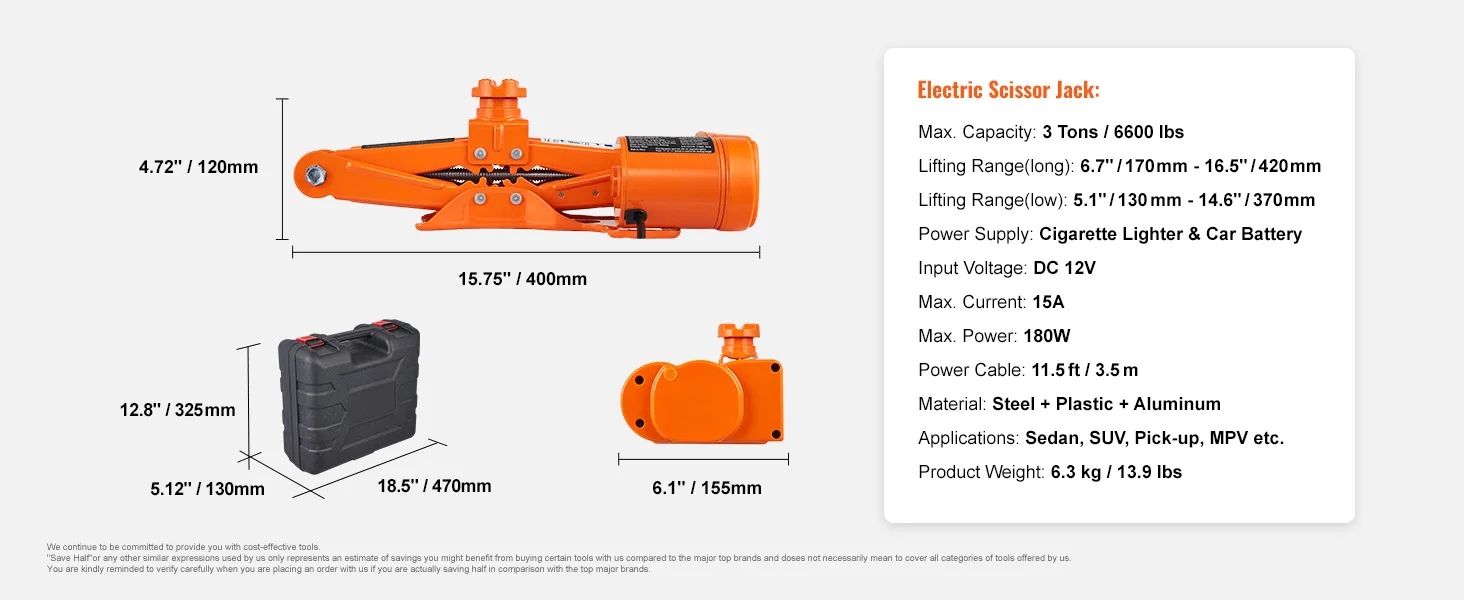 Electric Scissor Jack Kit: Max. Capacity: 3.0 tons/6600 lbs. Lifting Range(short lifting head): 5.1''-14.6"/130-370 mm. Lifting Range (long lifting head): 6.7''-16.5"/170-420 mm. This electric car jack kit is a lifesaver during roadside emergencies and can be used for at-home garage repairs. It is suitable for sedans, SUVs, vans, or any vehicle that suits its capacity.