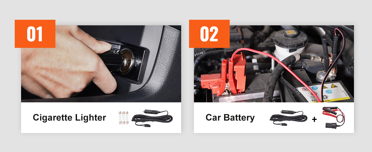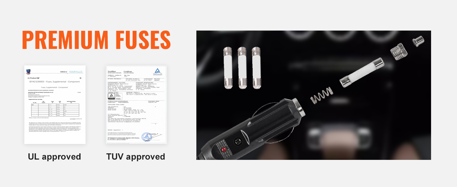 More than 1 way to charge: The electric jack for car can be powered by a 12V cigarette lighter or car battery and equipped with an extended 11.5 feet power cord, allowing it to be set by the front or rear tire. We also provide you with three spare fuses; our fuses are TUV and UL-certified, ensuring a confident experience every time.