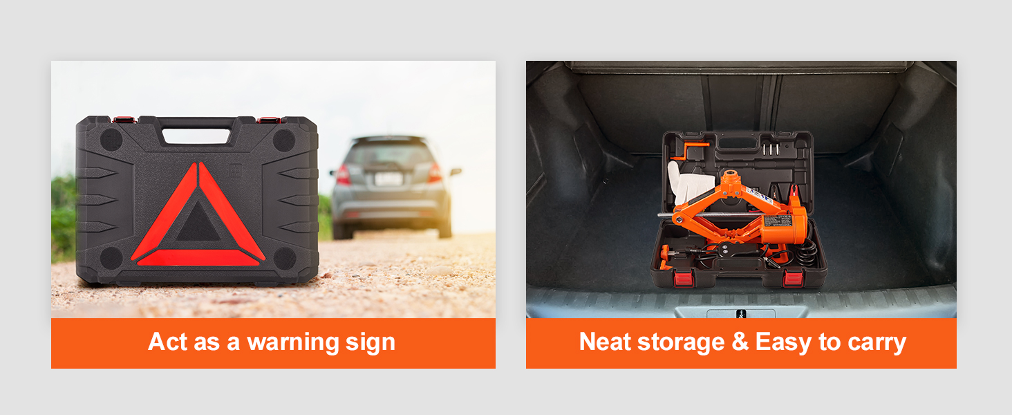 Multi-Function Carrying Case: Everything you need to get started is provided and well organized in the toolbox. Our electric jack kit includes an electric car jack, 2 pcs saddles, 3 pcs spare fuses, gloves, a battery clip, a cigarette lighter power cable, and a tough case. Additionally, a luminous red triangle on the box's exterior can be used as a warning sign when changing tires on the roadside.