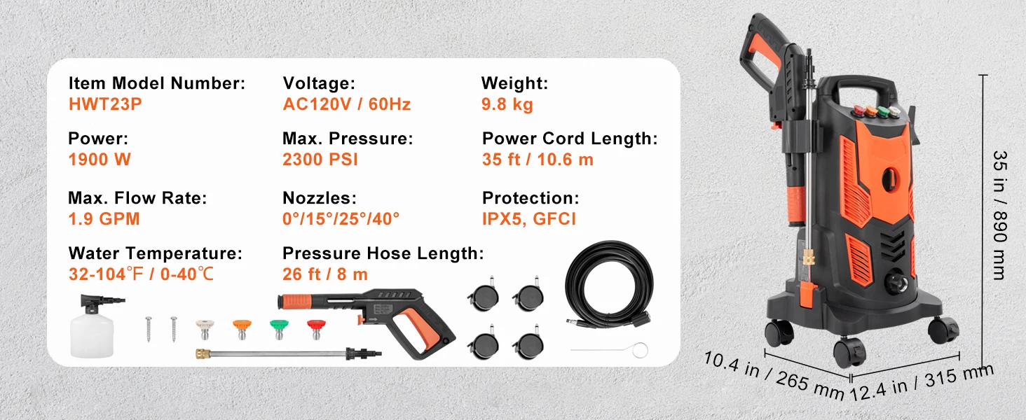 2300PSI High-pressure Washer: Built with a powerful 1900 W motor that generates a high water flow rate of up to 1.9 GPM. Hence, electric pressure washer can completely clean up old paint, oil, weed, and other stubborn stains. Ideal for homes, RVs, patios, fences, decks, driveways, cars, lawn equipment, etc. Automatically stops working when temperatures reach over 266℉, ensuring ultimate security and consistent high quality performance.