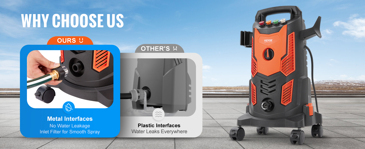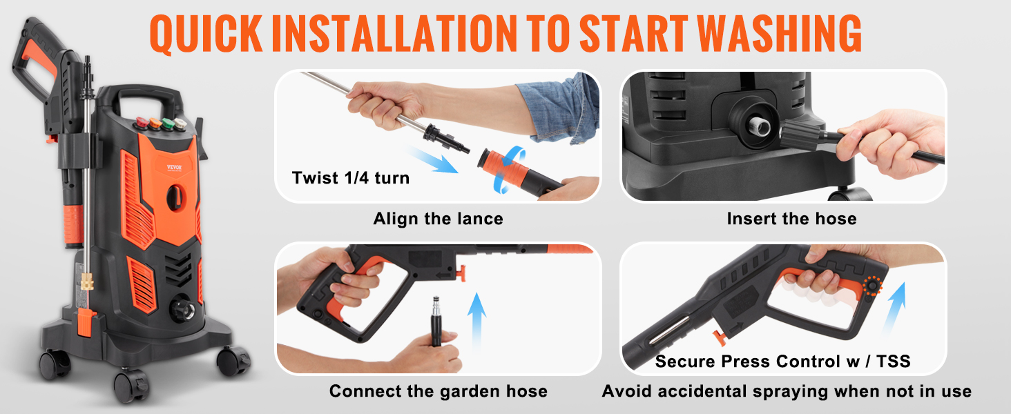 Extended Hose & Leak-proof: A 26 ft hose allows for flexible cleaning in any large area. Our high-pressure washer adopts a sturdy metal water inlet and outlet to avoid water leakage, so you no longer have to worry about water spraying everywhere. IPX5 waterproof. Get ready to get every job started right.