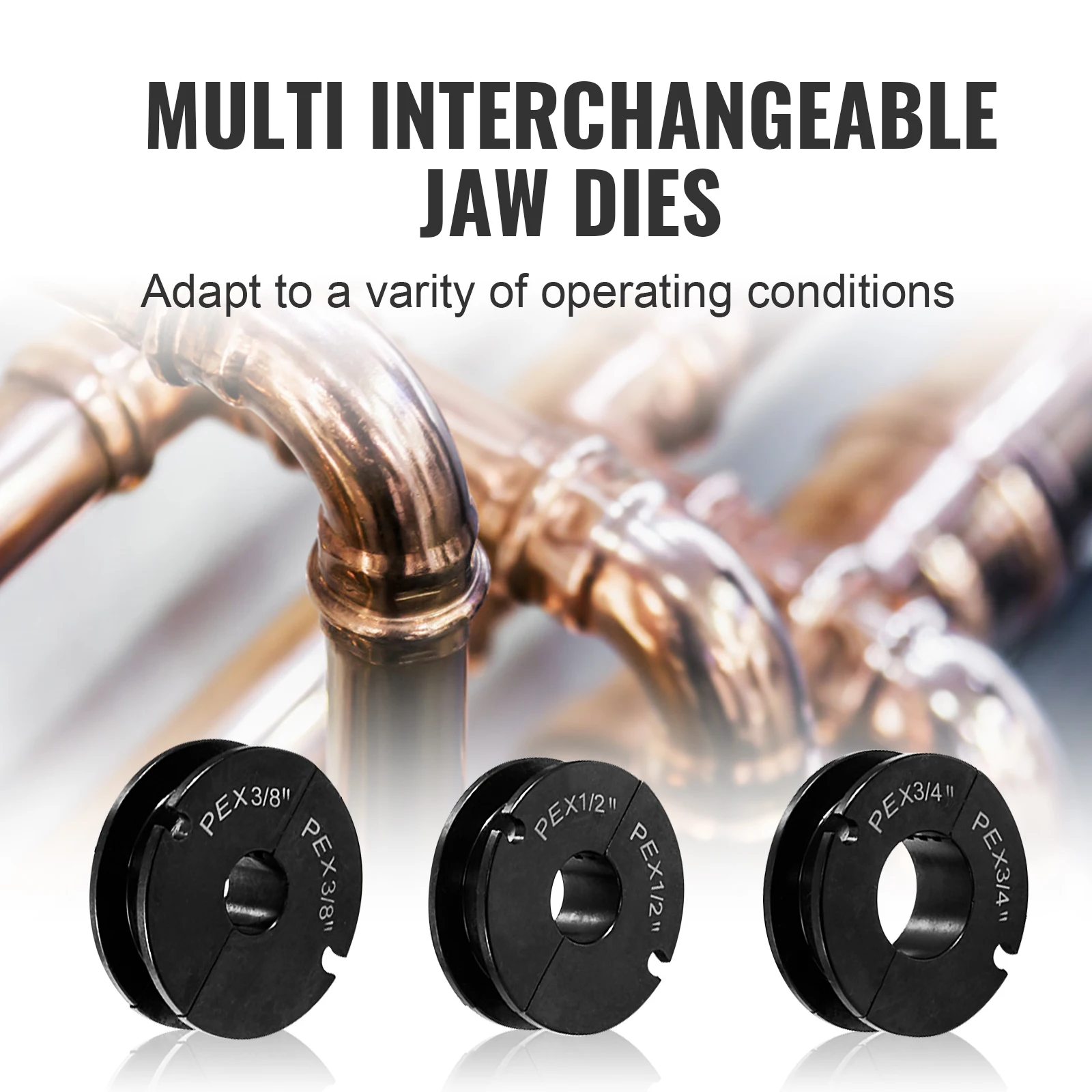 SucceBuy PEX crimping tool exhibits excellent crimping capabilities, allowing for rapid completion of pex crimping and copper ring removal. 3 jaw dies: 3/8", 1/2", 3/4", caters to various copper ring crimping needs. Also comes with Go/No-Go gauge, PEX tubing cutter, and copper ring removal tool.