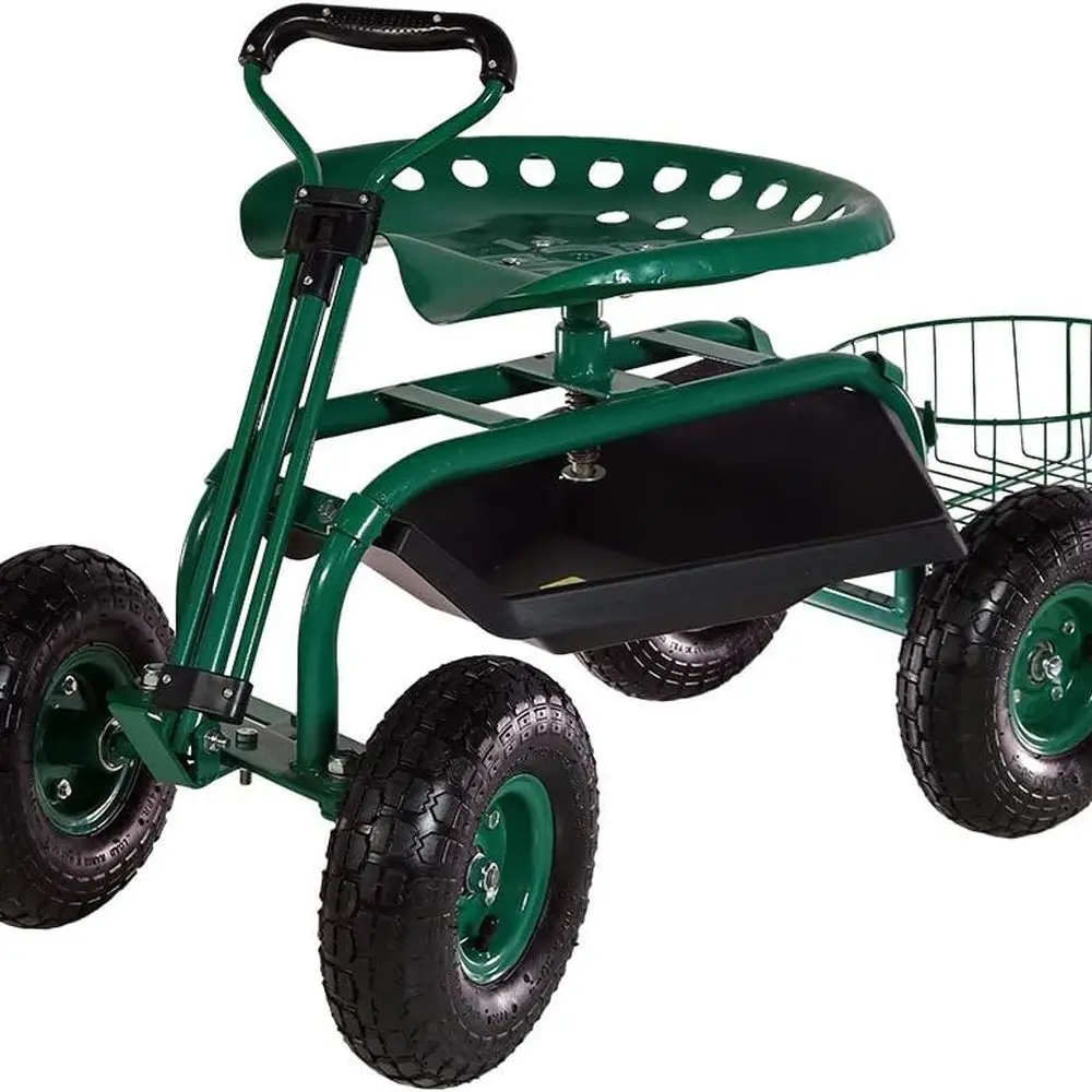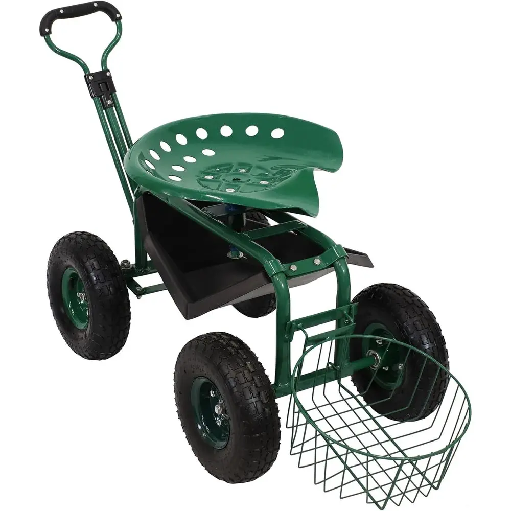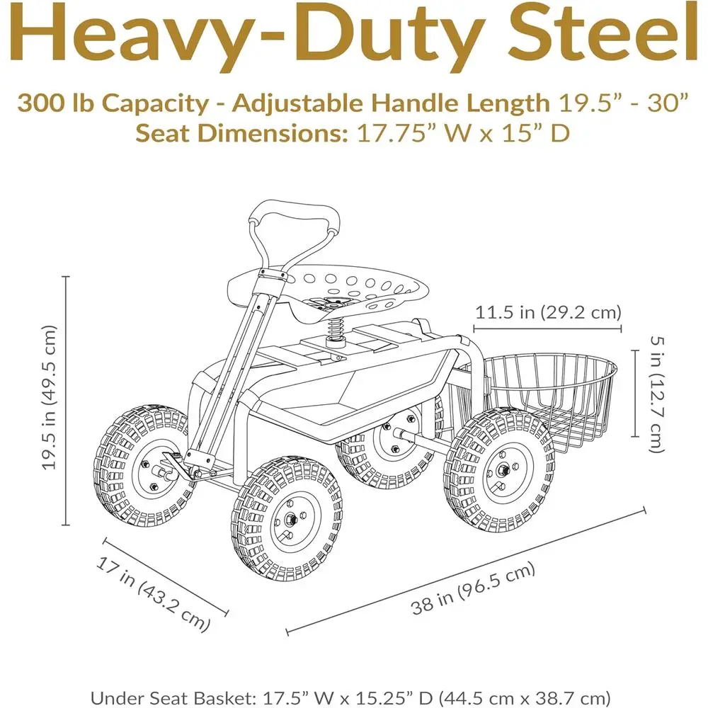 DURABLE DESIGN: This heavy-duty rolling garden seat frame is made from powder-coated steel. It features a removable round planter basket and coated tire rims. It also has a plastic utility tray beneath the seat. Steel axles and semi-pneumatic wheels ensure that this rolling garden stool will last through many years of landscaping and outdoor projects. Plus, the extendable steering handle makes it easy to pull the lawn cart.