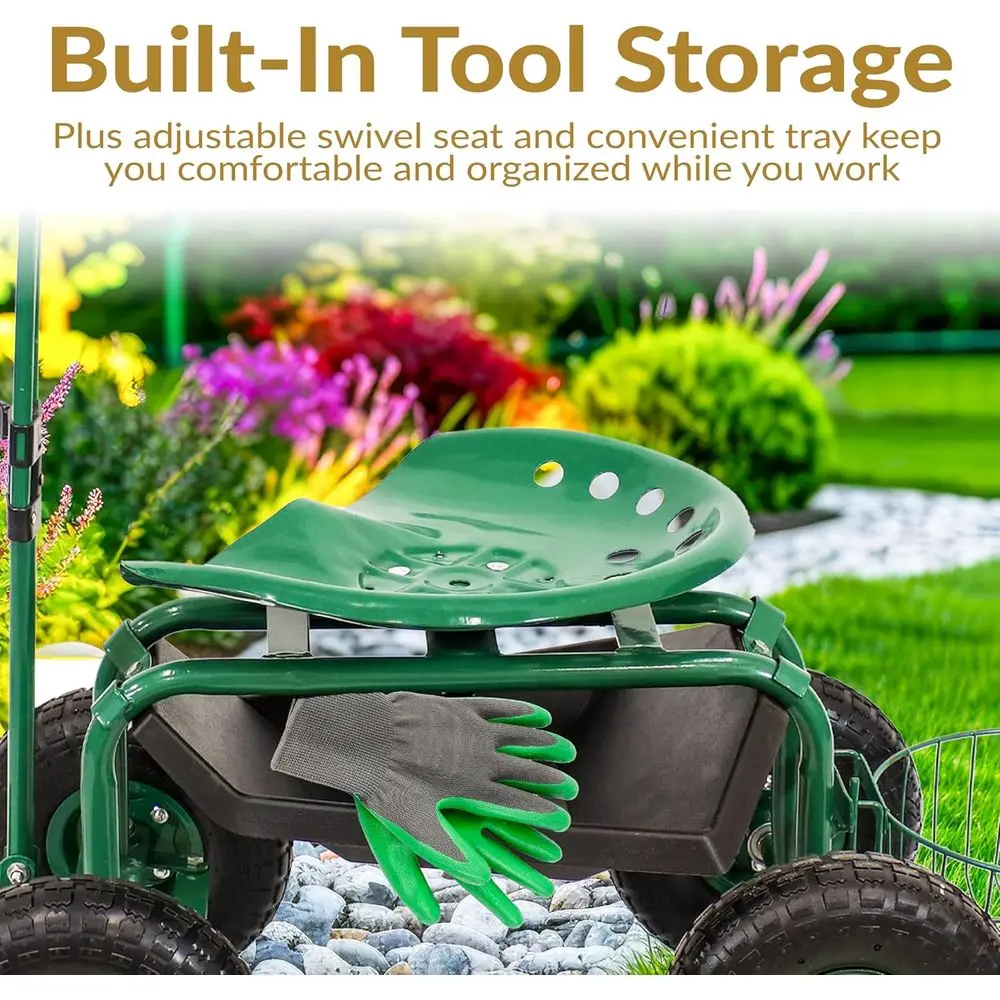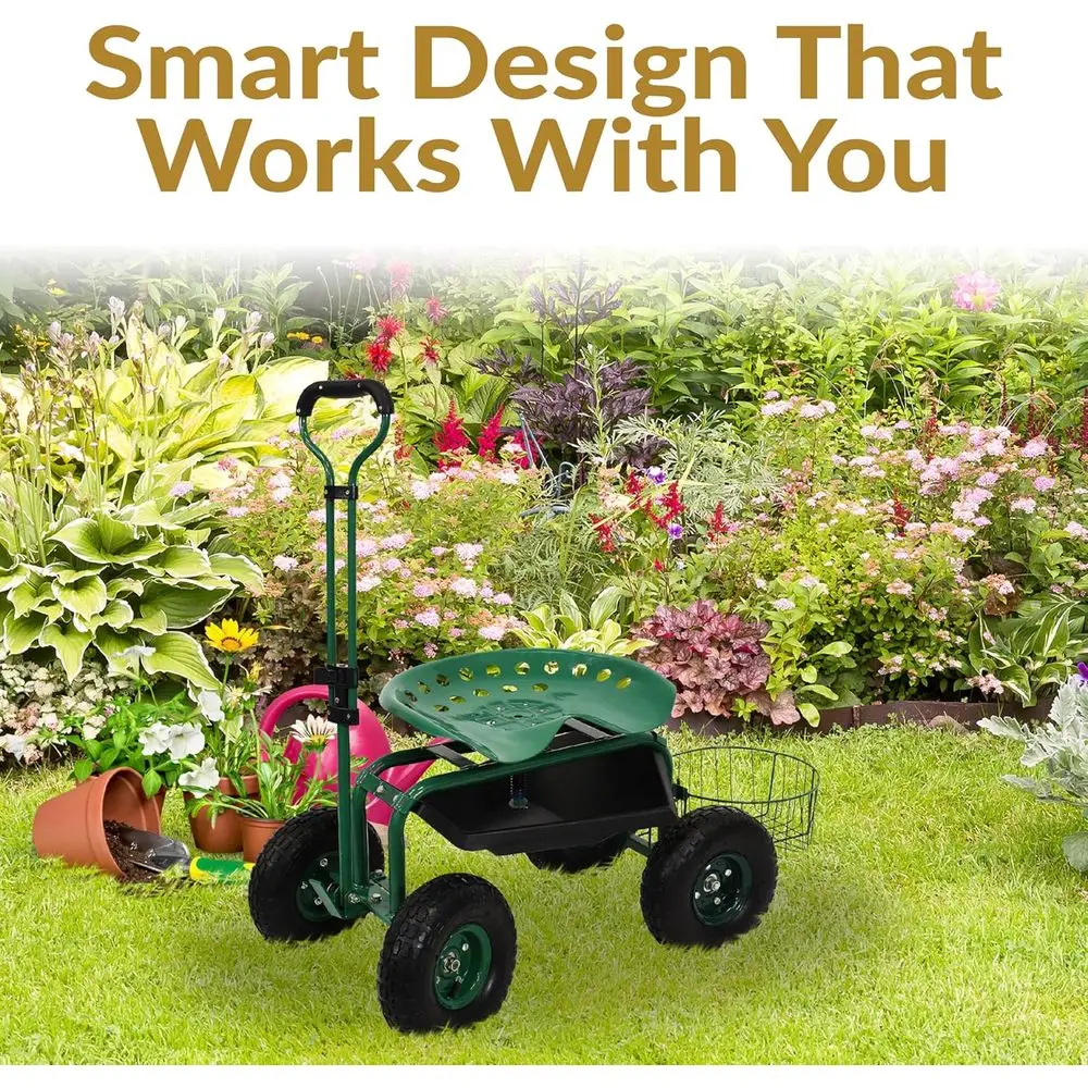 Sunnydaze Garden Cart with Wheels Garden Stool on Wheels – Rolling Gardening Seat with Extendable Handle Swivel Seat Green