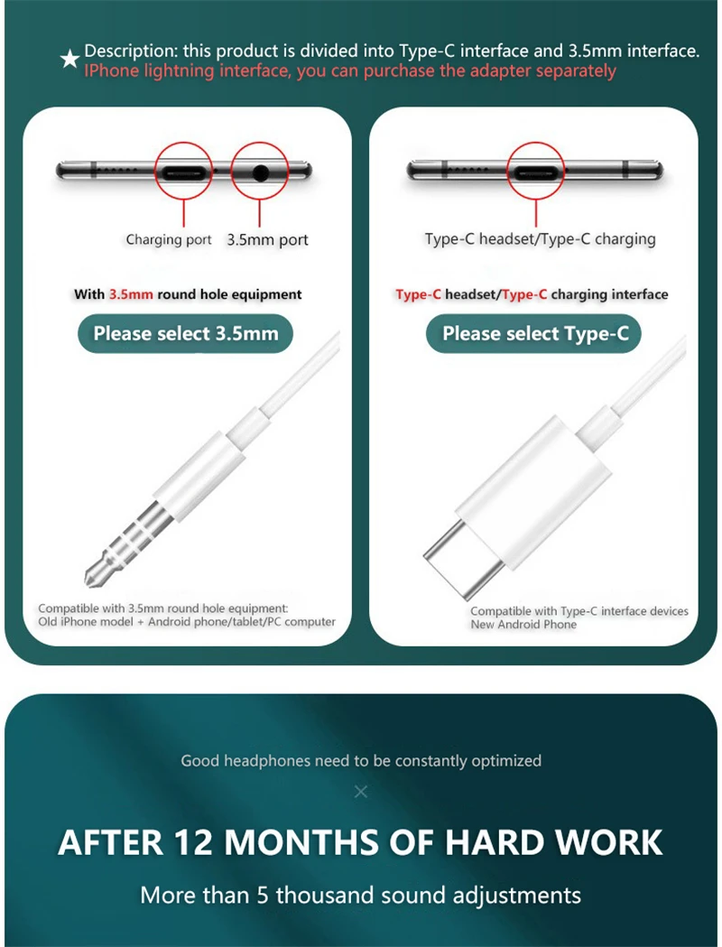 There are two types of earphones: 3.5mm round port and Type-C port,Please choose the appropriate interface according to your mobile phone earphone hole model.