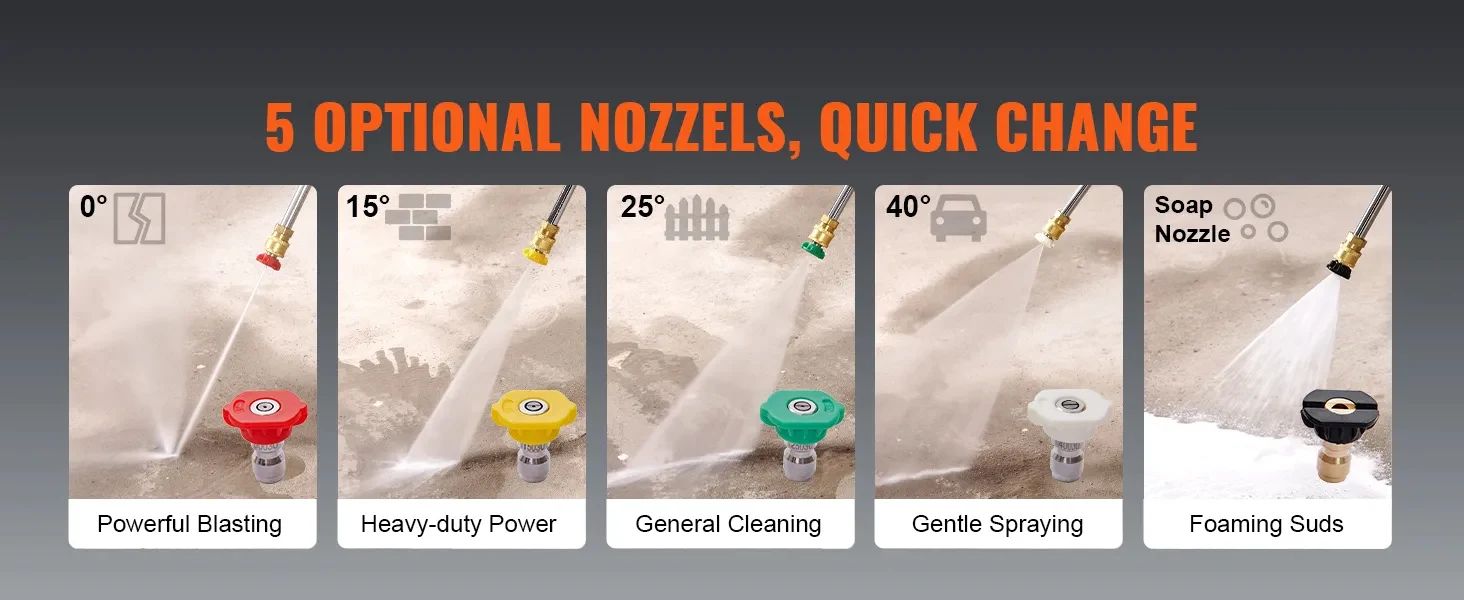 The VEVOR 3400 PSI pressure washer is flexible and good for many cleaning tasks. It comes with five metal spray nozzles. The 15° and 25° nozzles are great for cleaning brick and concrete surfaces. The 0° nozzle is useful for getting rid of tough stains. The 40° nozzle is great for softer tasks like cleaning windows and vehicles. Additionally, the soap nozzle helps with deep cleaning using foam. This range of nozzles makes this gas pressure washer suitable for many cleaning jobs, from decks and sidewalks to patio furniture and cars.