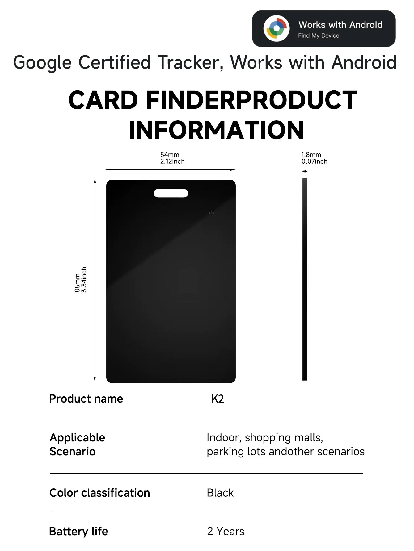 【Wallet Tracker Card for Android】Our wallet tracker specially optimized for the Android system, supporting Android 9.0 and above versions. (NOT for iOS & Huawei devices)The latest android tracker card ensures you never lose your valuables again. Google certified, no need for additional apps, instantly locate through Google Find Hub. In regions with a high number of Android devices, location updates only take 2 minutes. Place it in your wallet, luggage and more to locate your missing items.