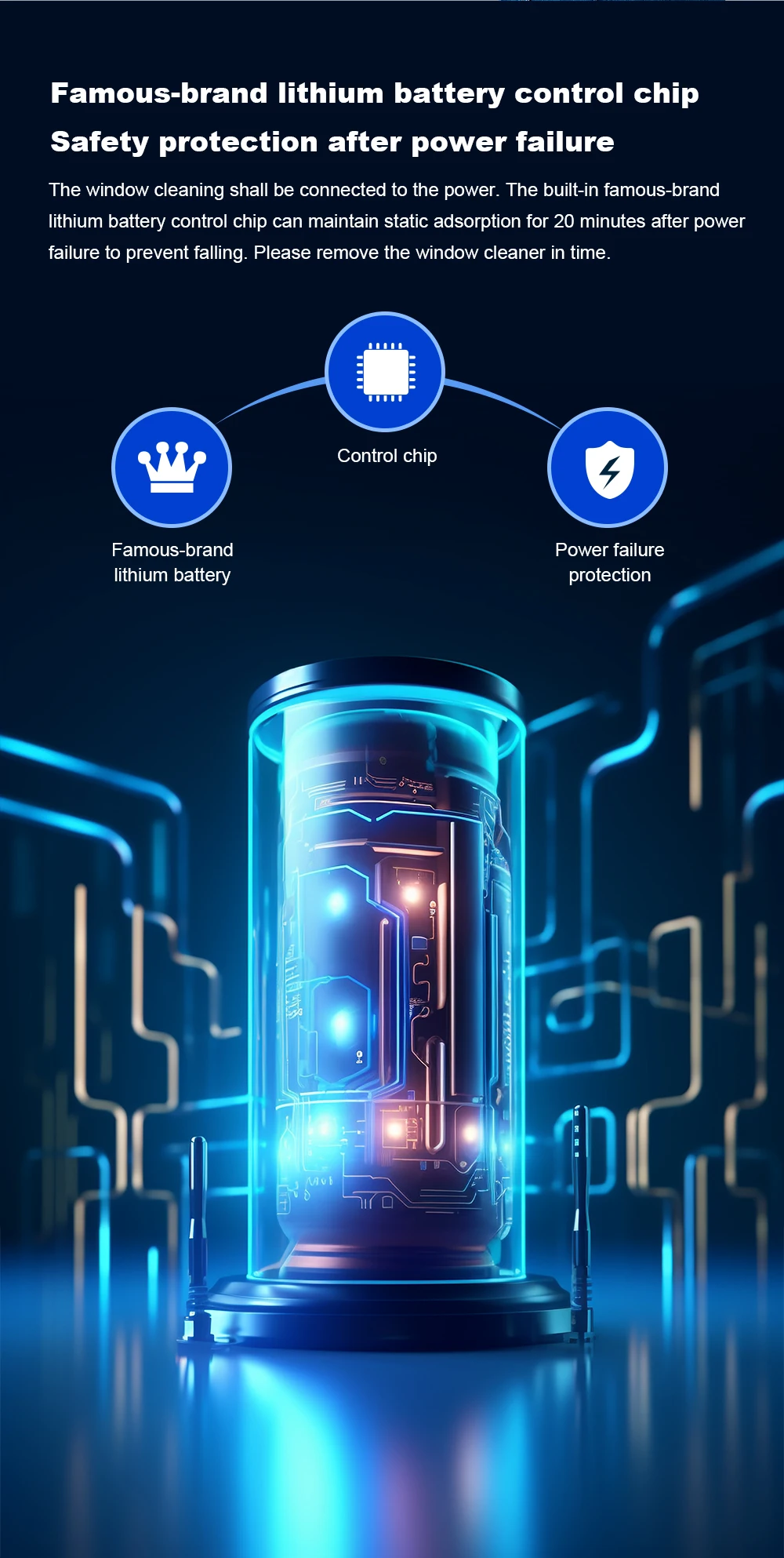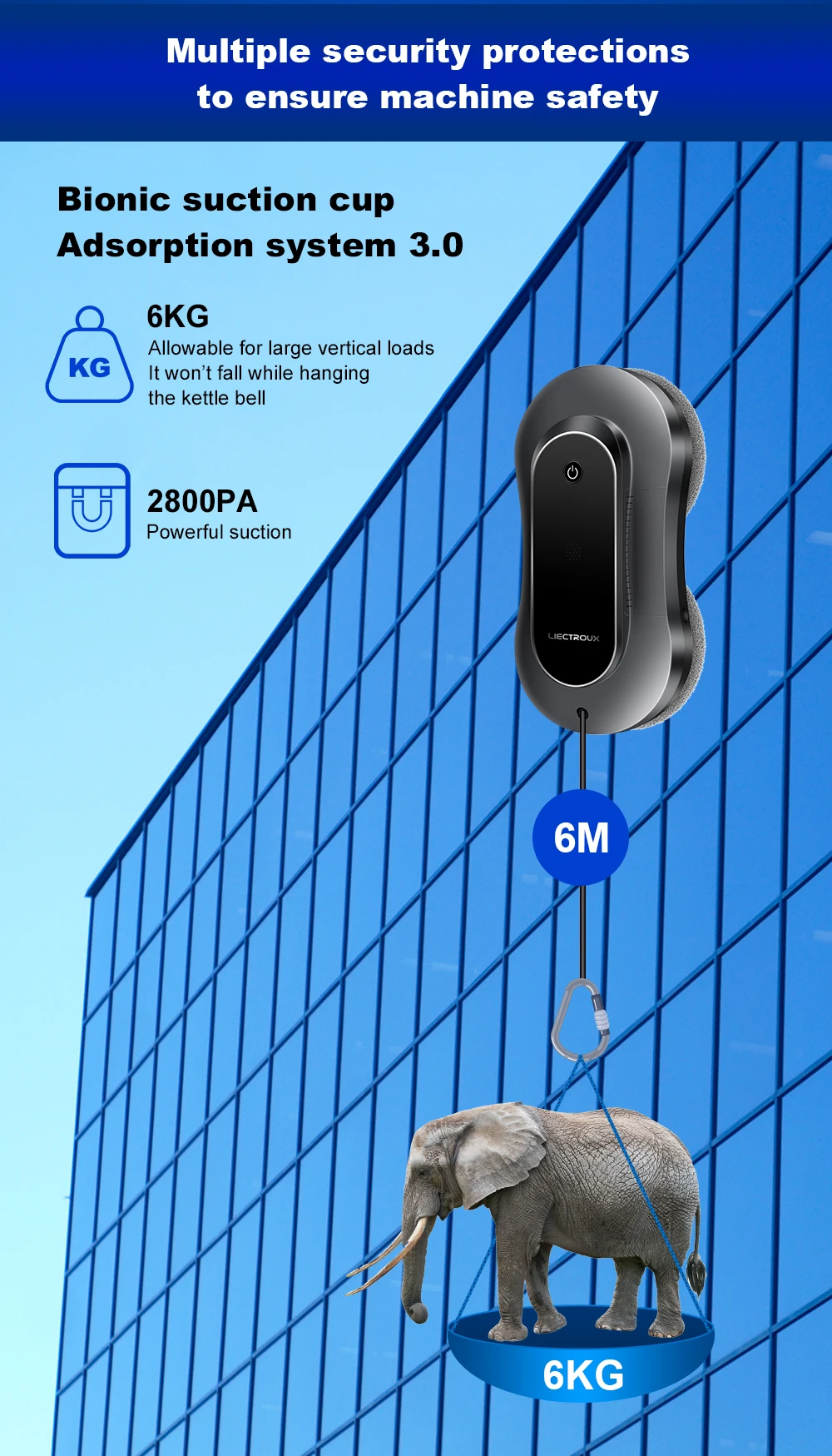 power off backup battery can also be adsorbed for about 25-30 minutes to prevent the machine from falling off power, safety design is guaranteed; while being equipped with a climbing level safety rope lock to provide protection for high-rise window cleaning.