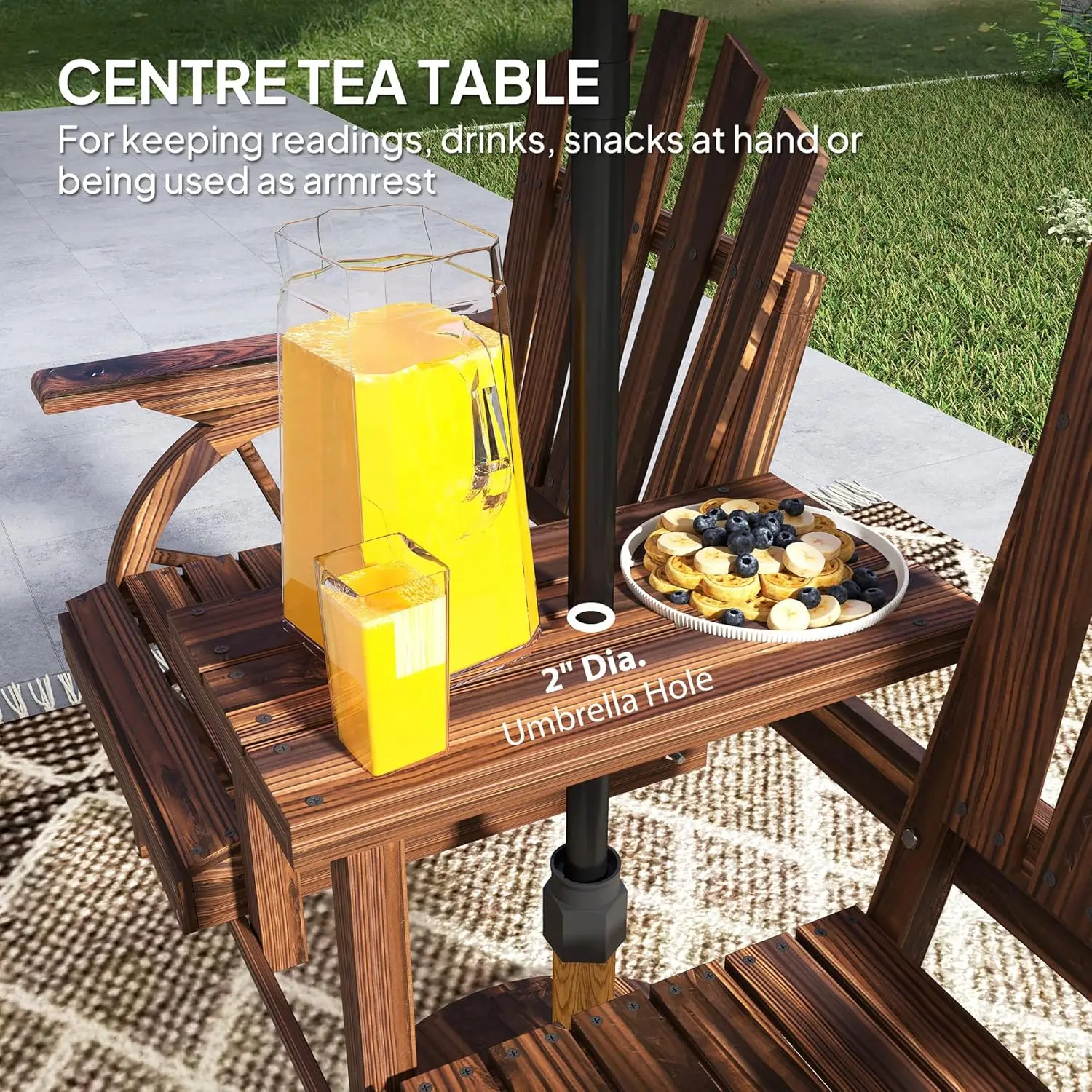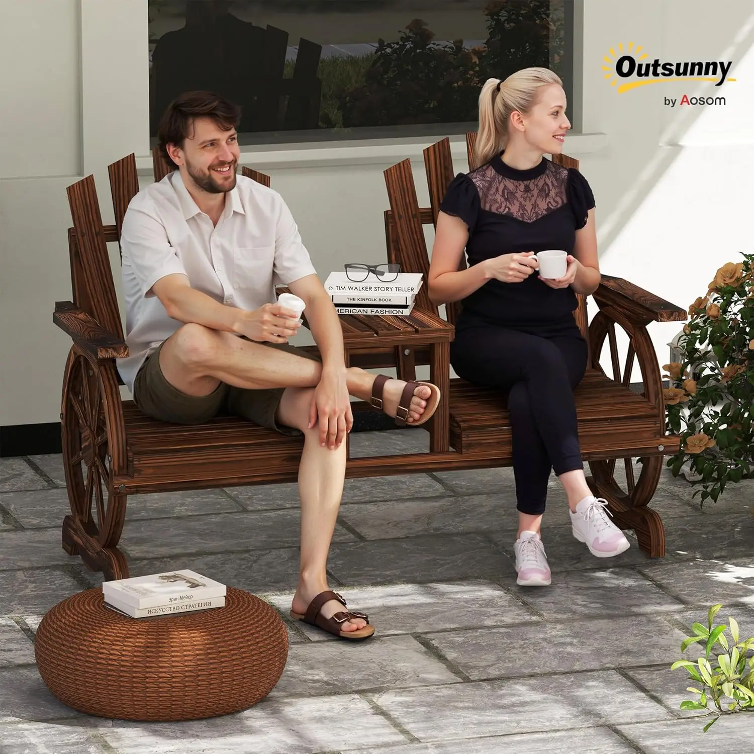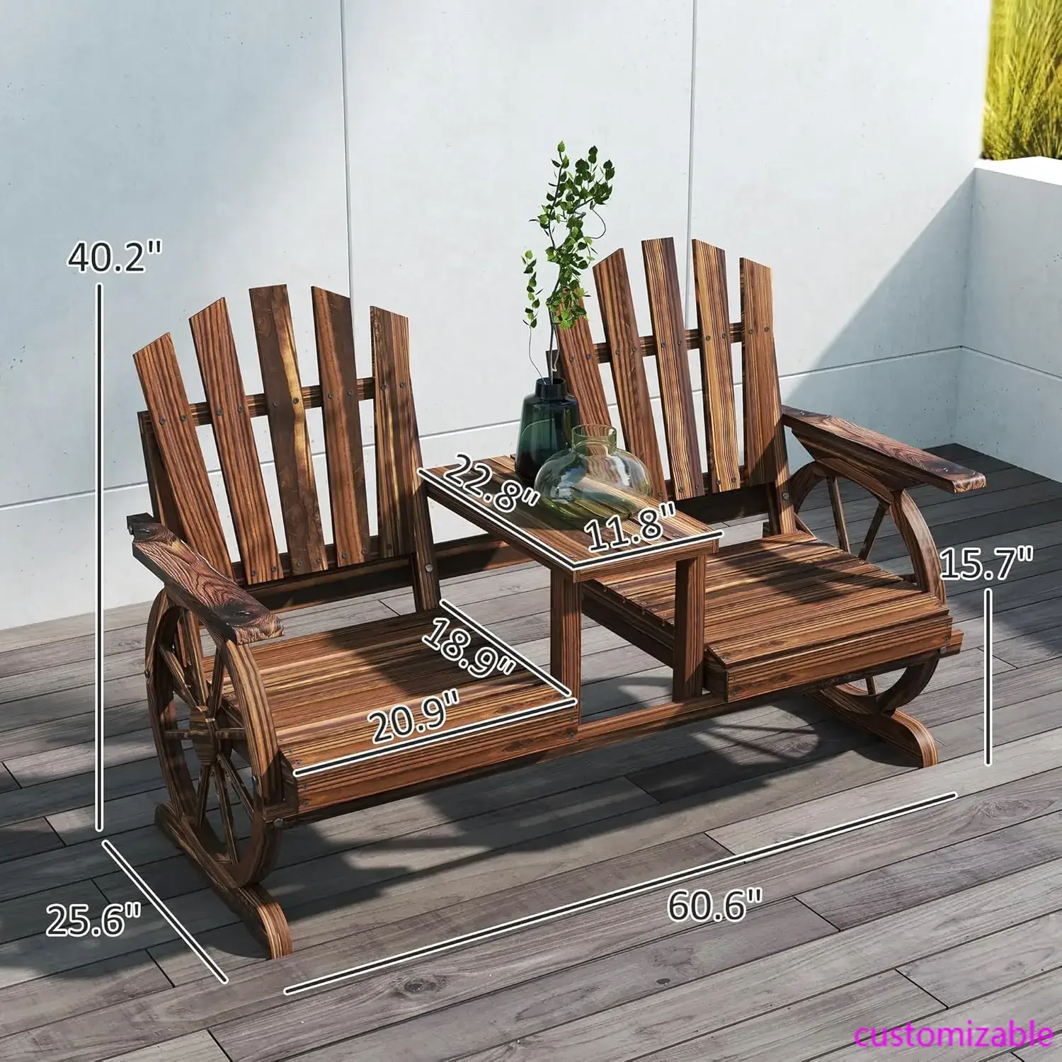 Wooden Garden Bench with Table, Umbrella Hole, 2-Seat Wagon Wheel Outdoor Bench with Slatted Seat, High Backrest, Armrests for Backyard, Patio, Garden, Carbonized