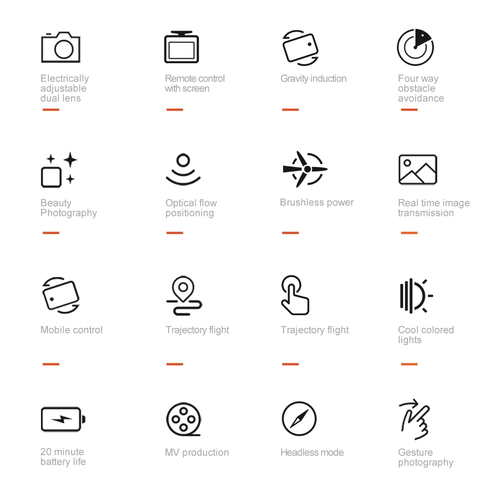 Functions: up/down, forward/backward, left/right turn, lateral flight, headless mode, optical flow positioning hovering, electric dual camera, four-sided obstacle avoidance, 360-degree roll, altitude hold mode, WiFi FPV, with screen control remote control, fuselage power display